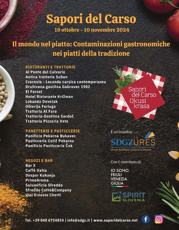 Autunno ricco di sapori per scoprire le specialità del territorio, a cominciare da Okusi Krasa - Sapori del Carso che quest’anno - dal 19 ottobre al 10 novembre - esplorerà un viaggio di contaminazioni gastronomiche tra ingredienti e culture diverse, per scoprire l’origine dei sapori del Friuli Venezia Giulia. Menù a tema in tutti i locali che partecipano all’iniziativa.