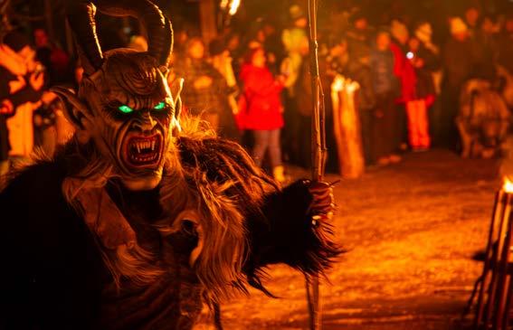 5.Dezember, spätnachmittags. In den Dörfern des Kanaltals geht die Sonne unter. Die Dunkelheit senkt sich über die verschneiten Lichtungen, als aus dem Wald Kuhglocken und Hörner ertönen. Dann ein erstes Flackern, ein zweites und noch eines; beängstigendes Getöse erhebt sich und im Laub der Bäume erscheinen Feuerzungen von Fackeln. Getragen werden diese von Krampussen, deren Name sich wahrscheinlich vom deutschen Wort Krampe (Kralle) ableitet. Der Ursprung dieser Unwesen, die halb Ziege und halb Teufel sind, liegt in der germanischen, wenn nicht gar keltischen Tradition. Die dämonischen Gestalten haben Hörner, Klauen, scharfe Zähne und eine grimmige Miene und leben mit Fellen und Pelzen bedeckt unter der Erde.