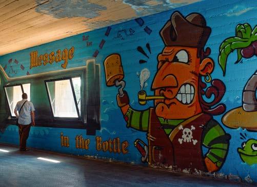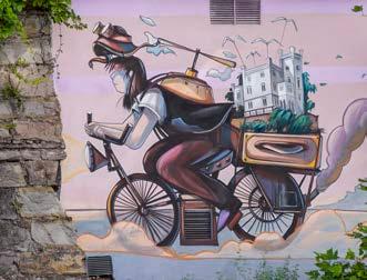 dem Karst erzählt), der von San Giacomo nach Draga Sant’Elia führt. Hier, in der Nähe einer Überführung, erscheint die im Dialekt verfasste Aufforderung, noch ein wenig weiter zu radeln: “Però... camina!!! ” (Komm... weiter!!!). Denn letztlich erzählen die Wandgemälde die Geschichten derer, die aus dem Kreis der Einflussreichen ausgegrenzt wurden und ihre Präsenz hilft bei der Suche nach sog. kulturellen Nischen.