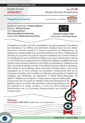 Η Πασχαλινή συναυλία της Κ.Ο.Θ. περιλαμβάνει την αριστουργηματική "Συμφωνία της Αναστάσεως" του Μάλερ, ένα κολοσσιαίο υπαρξιακό έργο που δεν αφήνει ασυγκίνητο κανέναν ακροατή. Η τραγική κατανόηση της φθαρτότητας της ανθρώπινης ύπαρξης οδηγεί στην αγωνιώδη αναζήτηση του Θείου. Ο Μάλερ βουτά αλύπητα με τη μουσική του μέσα στη ψυχή και πραγματεύεται τα πλέον επώδυνα συναισθήματα και τους μεγαλύτερους φόβους μας, χωρίς ωραιοποιήσεις σχετικά με τις δυσκολίες και την τραγικότητα της ανθρώπινης ύπαρξης, προσφέροντας όμως προοδευτικά μία ψυχική ανάταση με την ελπίδα της Αναστάσεως να βρίσκεται στο τέλος της επίπονης πορείας της ζωής. Έτσι ο θάνατος αντιμετωπίζεται ως λυτρωτής, αφού οδηγεί σε έναν καλύτερο κόσμο, μέσα από την Έσχατη Κρίση: «από το Θεό προέρχομαι και σε Αυτόν επιθυμώ να επιστρέψω». Συγκλονιστικά είναι και τα μηνύματα του φινάλε, όπου η ελπίδα της Ανάστασης πλημμυρίζει την καρδιά στην περίφημη ωδή «Ανάσταση, ναι ανάσταση!» Η ελπίδα πλέον πλημμυρίζει την καρδιά: «Πεθαίνεις για να ζήσεις». Το έργο απαιτεί τεράστιο καλλιτεχνικό δυναμικό και έτσι στη σκηνή του Μεγάρου Μουσικής Θεσσαλονίκης θα βρεθούν μαζί με την Κ.Ο.Θ., δύο σπουδαίες λυρικές τραγουδίστριες και δύο χορωδίες σε πλήρη σύνθεση, η δική μας Μικτή Χορωδία Θεσσαλονίκης και η εξ ανατολών προσκεκλημένη μας Istanbul European Choir.