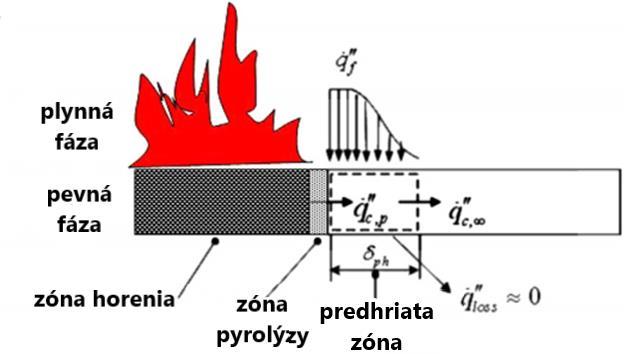 Obr. 10 Model prenosu tepla pre plameň šíriaci sa po pevných povrchoch (Zhang et al., 2013 – vlastná úprava)