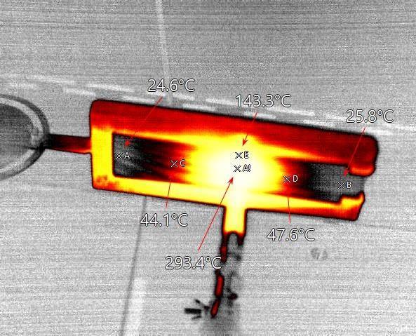Obr. 20 Rozloženie bodov pre meranie teploty povrchu pri modifikácii skúšky zapáliteľnosti (vpravo – 45°uhol, vľavo – 0° uhol)