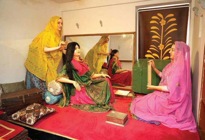 The Shringar Kaksh, or adornment room, features a captivating diorama that highlights the beauty rituals of royal ladies. It showcases exquisite items such as antique jewellry boxes, vintage hot water dispensers, and perfume bottles adorned with ornate silver lids.