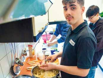 Fleischklopfen im Rhythmus rockiger Musik: Schon von weitem ist zu hören, dass die „Küchenmannschaft“ der AWO Produktionsschule Stellwerkstatt Spaß bei der Arbeit hat. Zusammen mit Fachanleiter Ronny Zimmermann bereiten vier junge Leute das Mittagessen für die 24 Schüler und das Personal vor. „Heute gibt’s Schnitzel mit Spargel und Sauce Hollandaise“, verrät der 20-jährige Kevin Priebe. Und Einrichtungsleiterin Daniela Ulbricht ergänzt: „Das gemeinsame Essen ist bei uns ein wichtiger Teil des Tages. Viele kennen das zu Hause gar nicht.“
