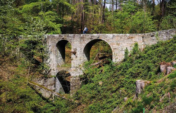 Die grüne Markierung führt in einem Wiesensattel links auf einen der Jagdwege in den Tiefen Grund des Bonnewitzer Baches hinein. Schon bald kommt in einem stark gelichteten Waldstück die erste der Hohen Brücken in Sicht. Historischen Berichten zufolge wurden die Hohen Brücken im Jahr 1789 für das fürstliche Jagdvergnügen des Dresdner Hofes errichtet und sollten überdies einen landschaftsgestalterischen Akzent setzen. Auch wenn heute nur noch schwer vorstellbar ist, dass auf den Jagdwegen einst Pferdekutschen unterwegs waren, bilden die Hohen Brücken einen charmanten Blickfang. Nach etwa sechs mehr oder minder großen Brücken führt uns die grüne Markierung mal abwärts, mal aufwärts und zuletzt auf die Höhen bei Zaschendorf. Hier können wir am Wochenende im Café Windmüllerhaus (Straße „Zum Triebenberg“) einkehren und bei einem Stück Kuchen die herrliche