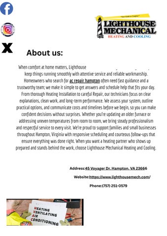 Lighthouse Mechanical Heating and Cooling is your local, full-service partner for dependable comfort solutions across the Virginia Peninsula and surrounding communities. Contact Us: Address: 45 Voyager Dr, Hampton, VA, 23666, US Phone: (757) 251-0579 Email: reception@lighthousemech.com Url: https://www.lighthousemech.com/