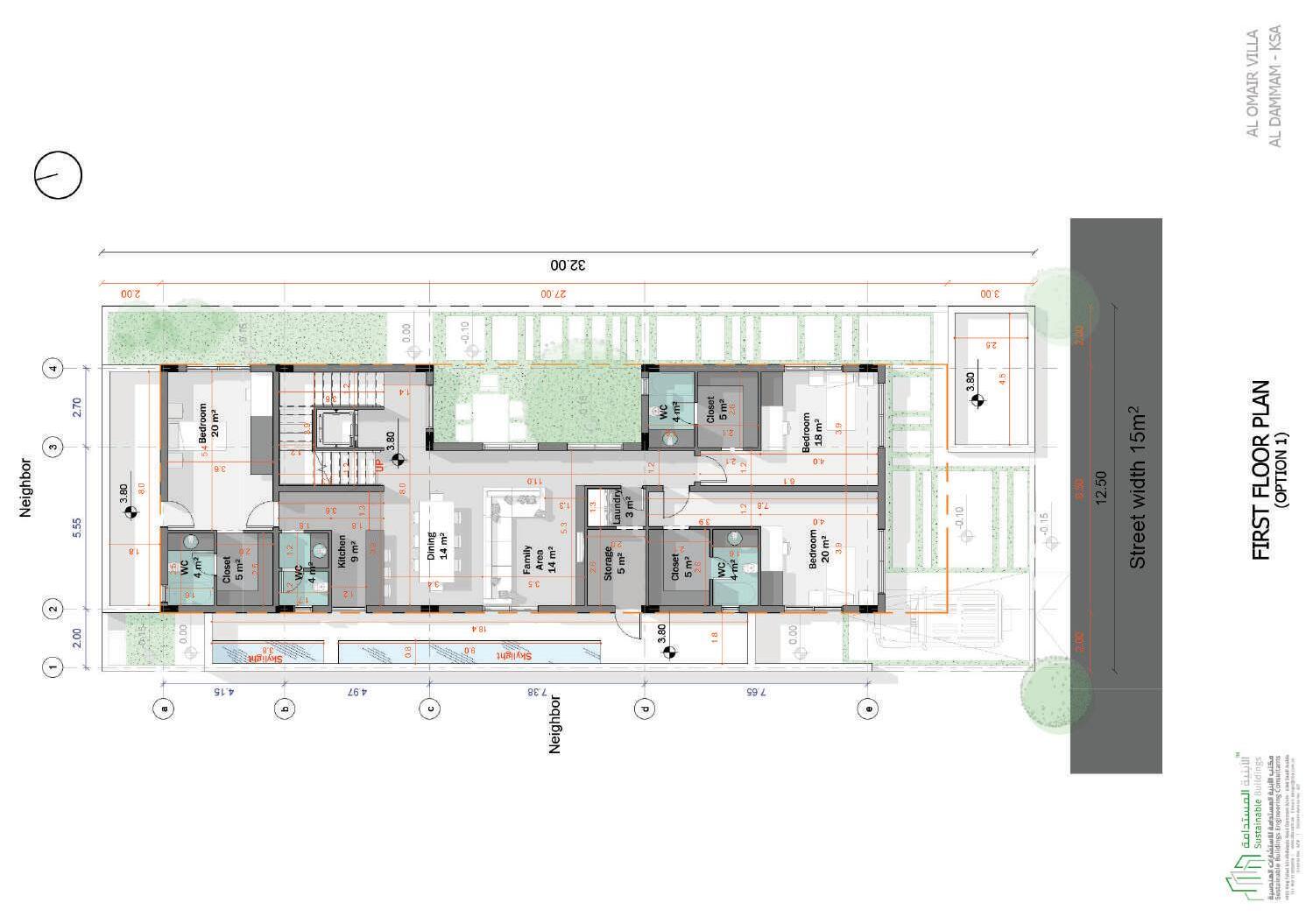 Custom designed wall layers (U= 0.42 as per Saafat Sustainability Standards). All the ‘Revit Families’ used are BIM LOD300. A small door swing was used to better use the small area of the bathroom. Wall length is to easily use pre-cast concrete walls. All pipelines were tucked along the long side with a 10 cm spacing for plumbing purposes. Inner walls with half porcelain fixture for durability.