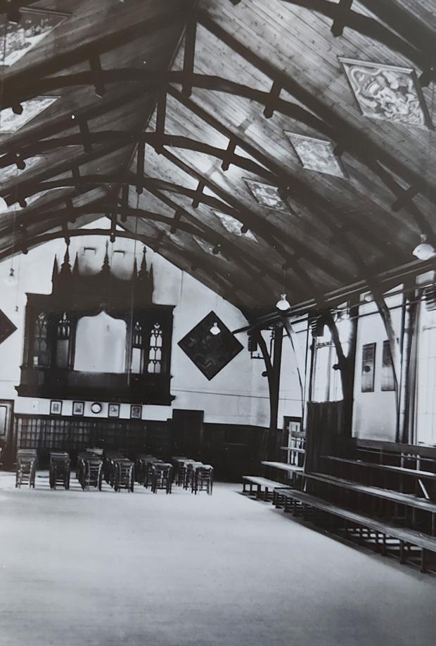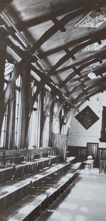 “The hatchments in its ceilings have looked down on School assemblies, choral practices, examinations, balls and indeed functions of every kind since the days, in 1896, when it was the only room in the School with both lighting and a modicum of heating.”