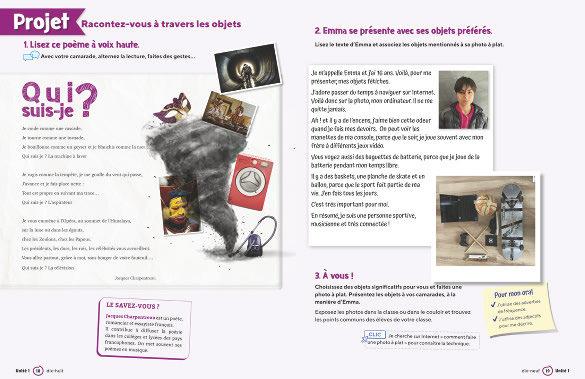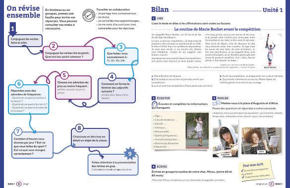 Le Livre de l’élève comprend 6 unités à l’approche variée afin d’éveiller l’intérêt de l’élève. Chaque unité intègre de nombreuses thématiques autour d’une notion centrale et se décline en 4 leçons qui permettent d’acquérir les compétences pour réaliser le projet de l’unité. La page « On révise ensemble » met en œuvre un travail collaboratif pour partager les connaissances de l’unité, consolider les apprentissages et vérifier que tout a été correctement acquis. Finalement, le bilan vient compléter l’unité et permet de valider l’acquisition des compétences. Dans les annexes, les entraînements au DELF proposent des épreuves afin de préparer les élèves aux examens de certification du niveau travaillé.