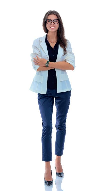La chica lleva unas gafas grandes. También lleva una chaqueta blanca ligera y, bajo la chaqueta, lleva una camisa negra. Viste unos pantalones azul marino. Lleva también unos zapatos de tacón muy elegantes.