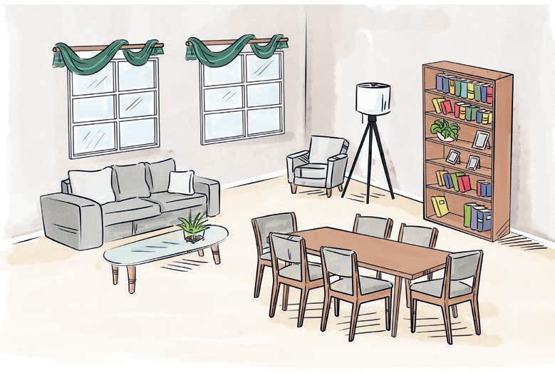 El sofá está cerca de la pared. Las sillas están al lado de la mesa. La lámpara está a la derecha del sillón.