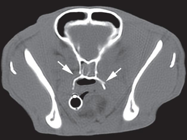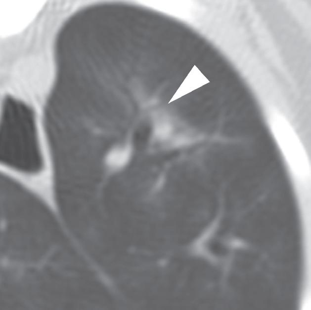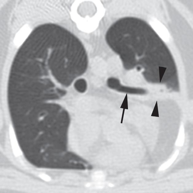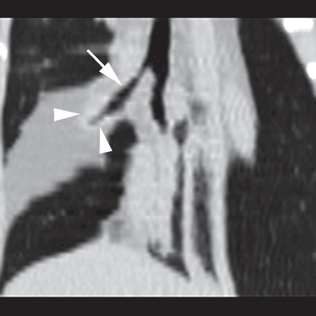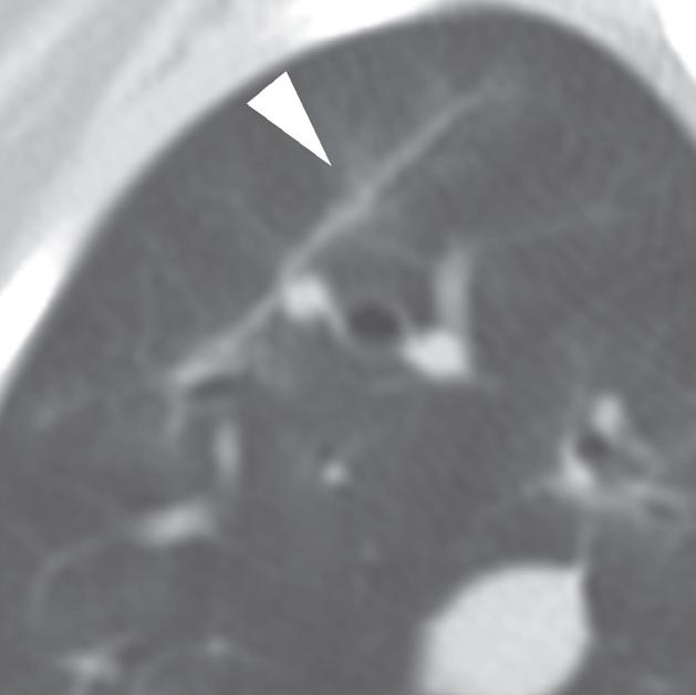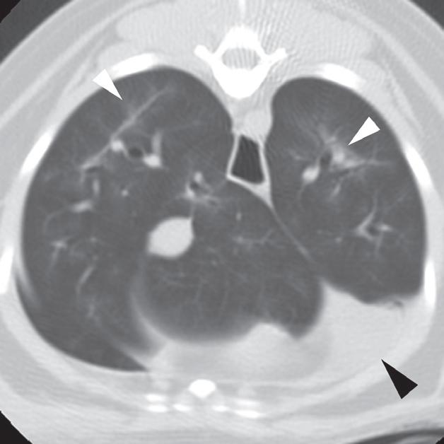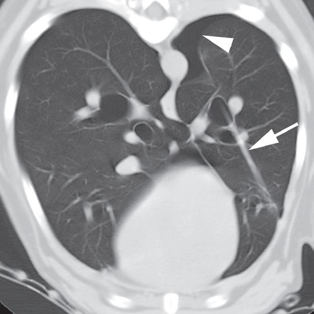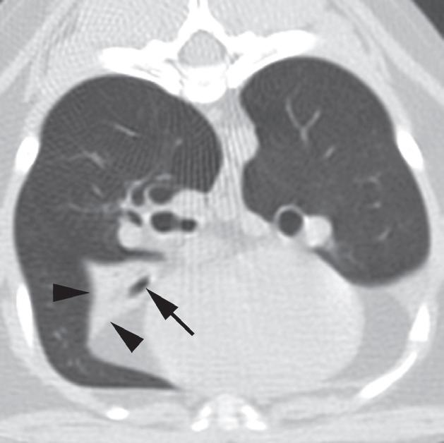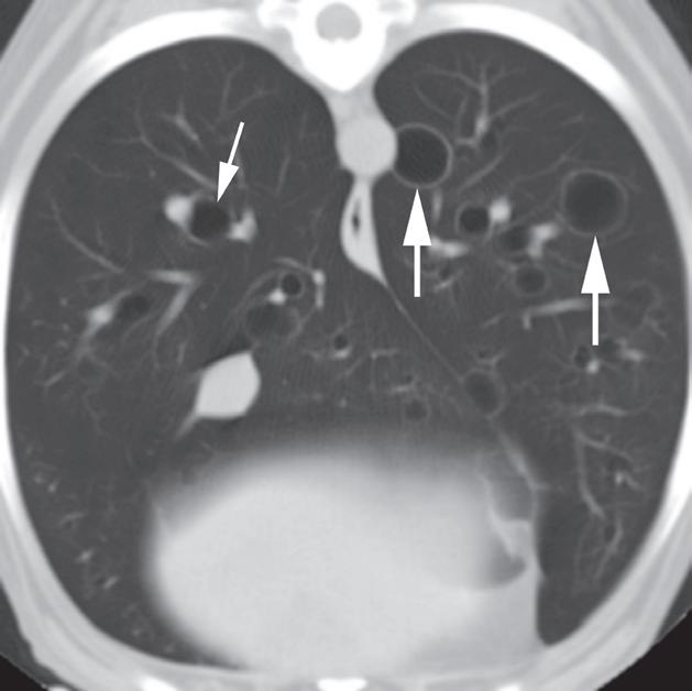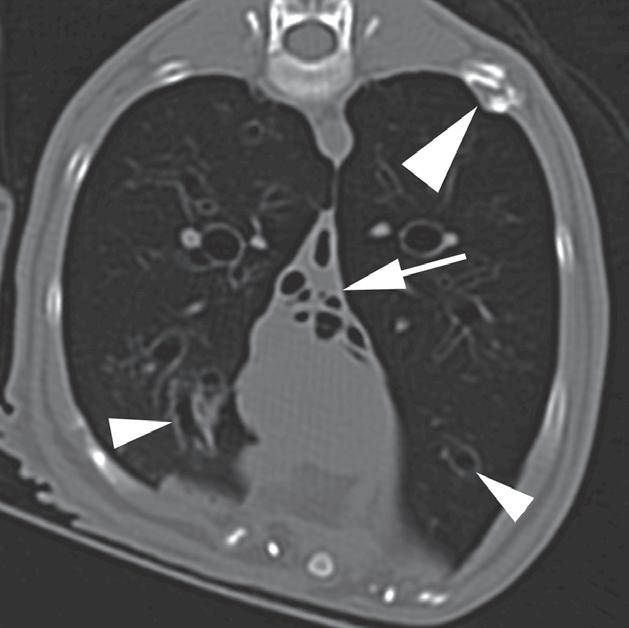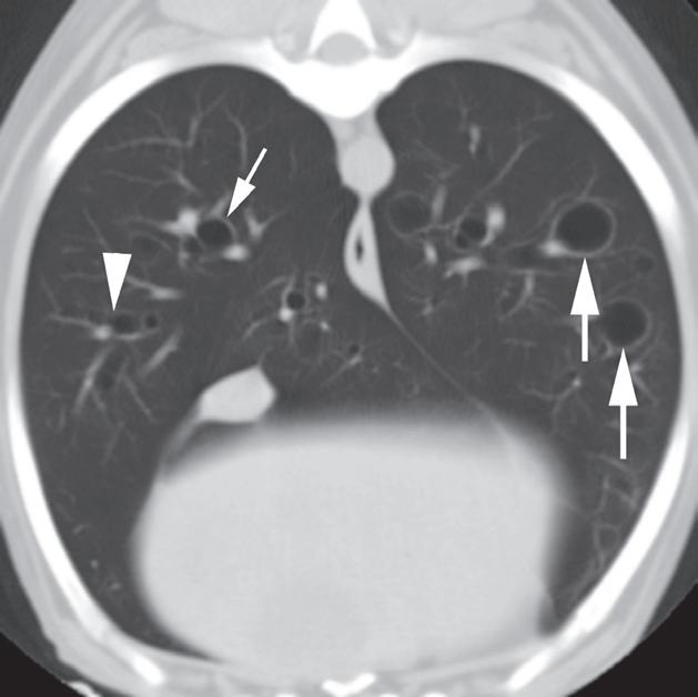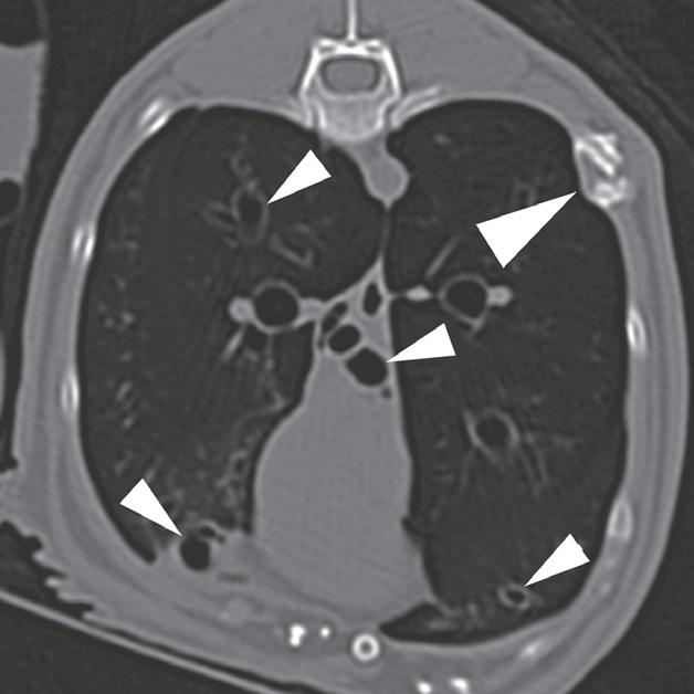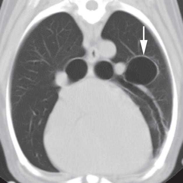 Reprezentatywne obrazy TK środkowej i doogonowej części klatki piersiowej, uporządkowane od strony doczaszkowej do doogonowej, ujawniły liczne cienkościenne pęcherze o różnej wielkości. Pęcherze były kuliste i odróżniały się od rurowatego kształtu dróg oddechowych podczas oglądania kolejnych obrazów. Miały również większą średnicę, niż można by oczekiwać w przypadku dróg oddechowych na obwodzie płuca (a–c – duże strzałki). W przeciwieństwie do pęcherzy, drogi oddechowe się rozgałęziały (c – grot strzałki) i towarzyszyły im tętnice oraz żyły płucne (b, c – małe strzałki). U tego pacjenta pęcherze nie powodowały żadnych objawów klinicznych i uznano je za rozwojowe. Ocena makroskopowa i mikroskopowa zmian z usuniętego podczas lobektomii płuca potwierdziła rozpoznanie obrazowe