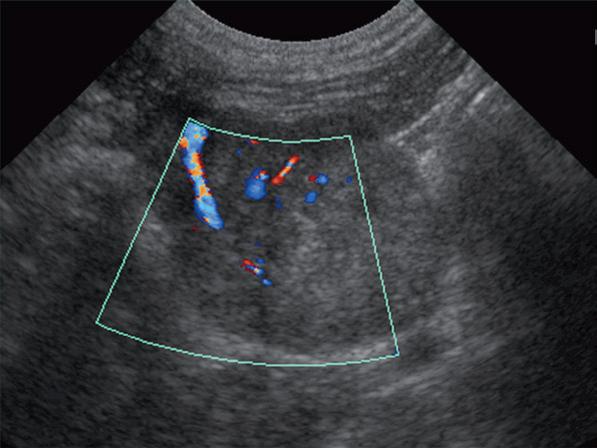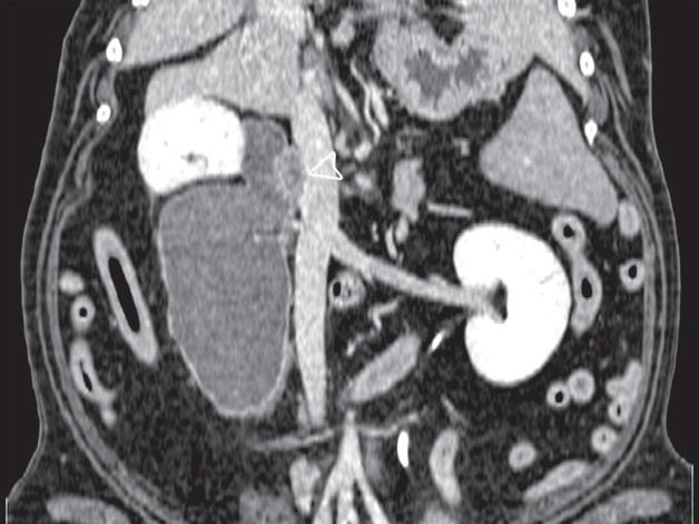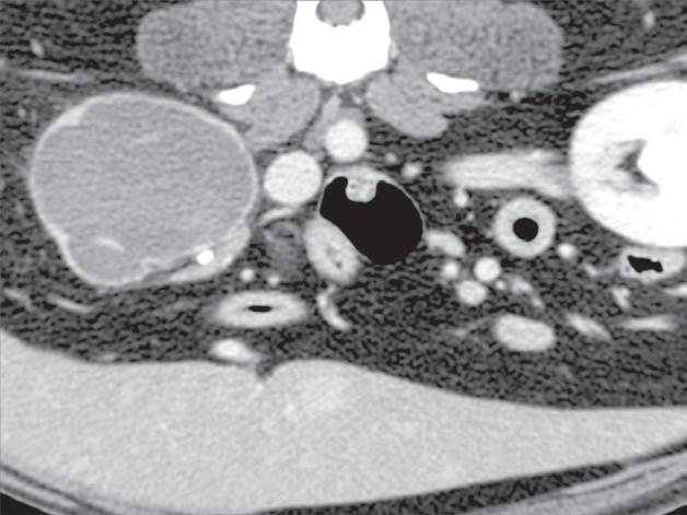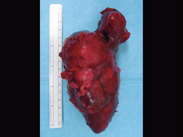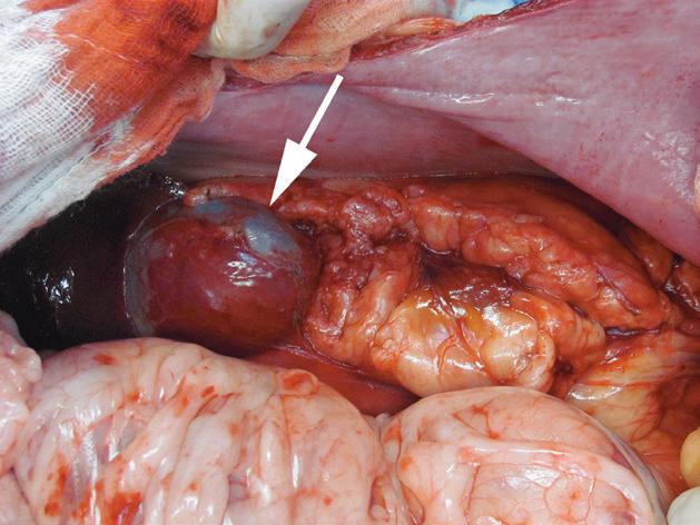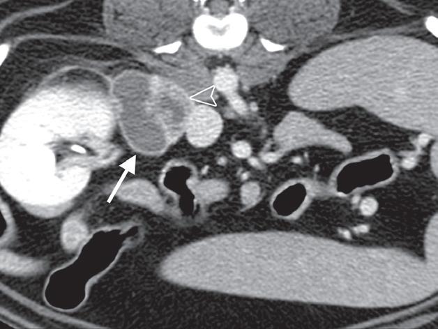 Badanie wykonano u 7-letniego rottweilera z rozpoznanym guzem nadnercza oraz nagłymi objawami dyskomfortu jamy brzusznej. Obrazy na ryc. a–c uporządkowano od strony doczaszkowej do doogonowej. Nadnercze prawe jest powiększone (a, d – otwarty grot strzałki) i ma widoczną ekscentryczną komponentę torbielowatą o densyjności płynu, która rozchodzi się doogonowo (a, b – strzałki). Tkanka miękka rozrostu oraz torebka nadnercza wykazują obwodowe wzmocnienie pokontrastowe. Torbielowata komponenta zmiany rozrostowej widoczna na obrazie odpowiada krwotokowi, który rozciąga się doogonowo w przestrzeni zaotrzewnowej (d). Dobrzusznie od zmiany widoczny jest moczowód (b – grot strzałki). Diagnoza makroskopowa i histologiczna została potwierdzona po chirurgicznym usunięciu zmiany (e – strzałka). Proszę zwrócić uwagę na porównanie obrazu TK zmiany (d) z wyciętym preparatem makroskopowym (f)
