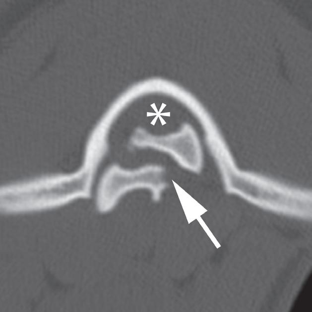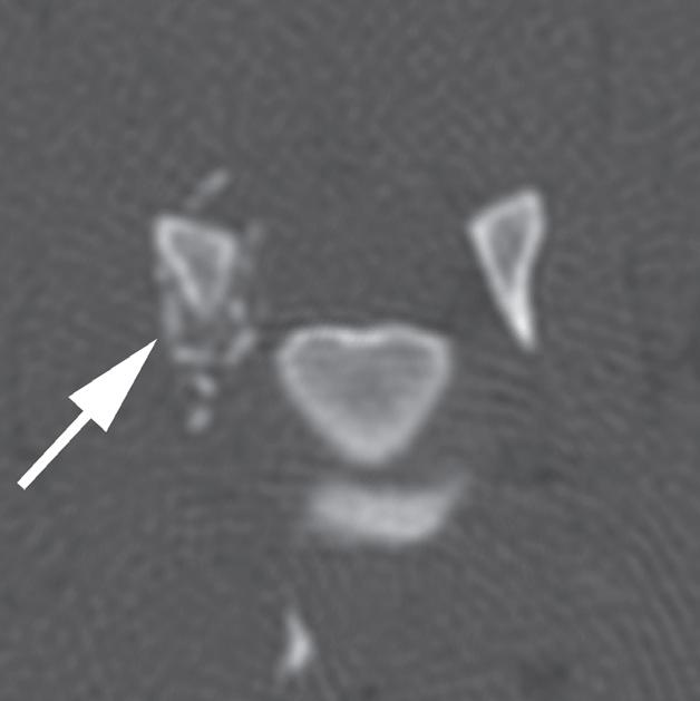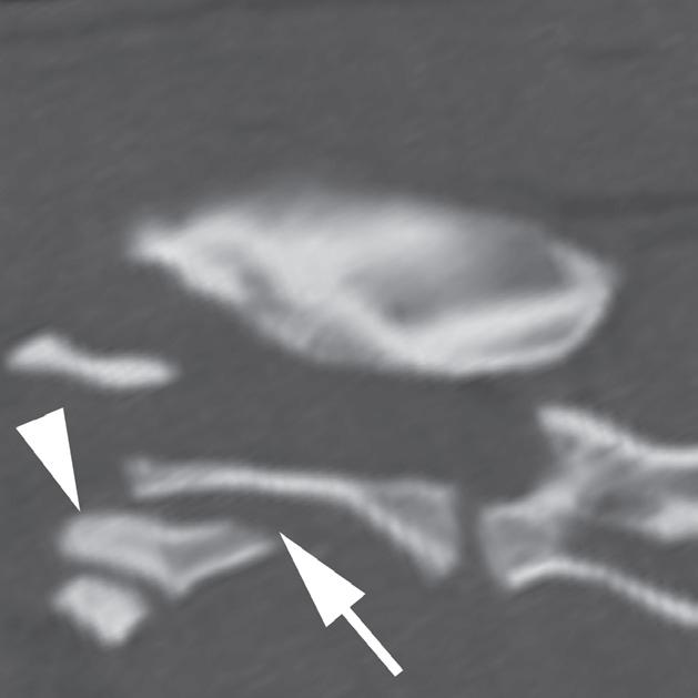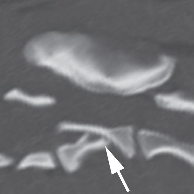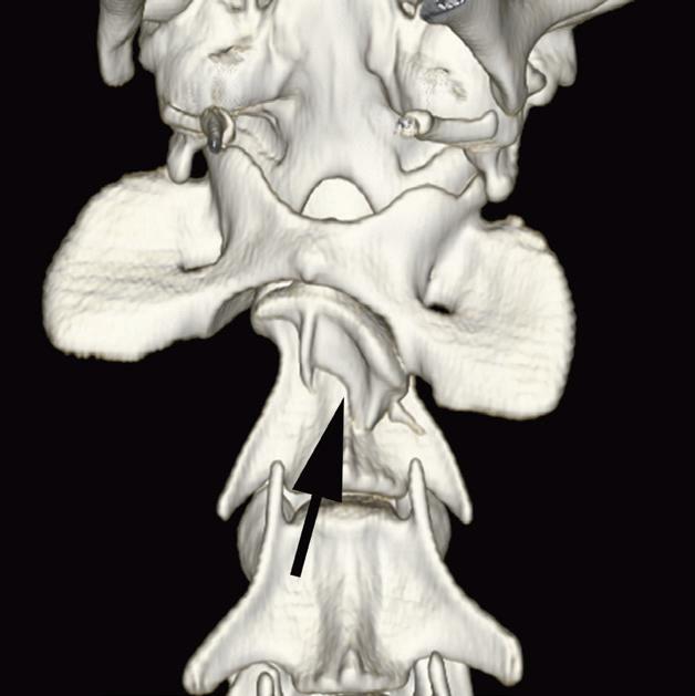Badanie wykonano u 2-letniej samicy owczarka australijskiego z bólem odcinka szyjnego kręgosłupa, ale bez deficytów neurologicznych, która 9 dni przed badaniem wpadła na ogrodzenie. Obrazy przedstawione na ryc. a–c ułożono od strony czaszkowej do ogonowej na poziomie zęba obrotnika (a – grot strzałki), doczaszkowej części C2 oraz środkowej części trzonu C2. Obraz na ryc. d to rekonstrukcja w płaszczyźnie strzałkowej przez linię pośrodkową, a na ryc. e zamieszczono obraz wykonany w pobliżu płaszczyzny strzałkowej obejmujący ząb obrotnika (e – grot strzałki). Widać przemieszczenie skośnego złamania trzonu kręgu obrotowego (axis) (b–f – strzałka). Przemieszczenie fragmentu złamania względem atlasu powoduje znaczne zmniejszenie średnicy kanału kręgowego (b – gwiazdka). Złamanie jest widoczne na radiogramie (g – grot strzałki), jednak poziomu zwężenia kanału kręgowego nie da się ocenić równie dokładnie jak na obrazach TK. Ze względu na upływ czasu od urazu i brak objawów neurologicznych pacjentkę leczono zachowawczo, jednak właściciel zwierzęcia nie zgłosił się na dalsze wizyty kontrolne