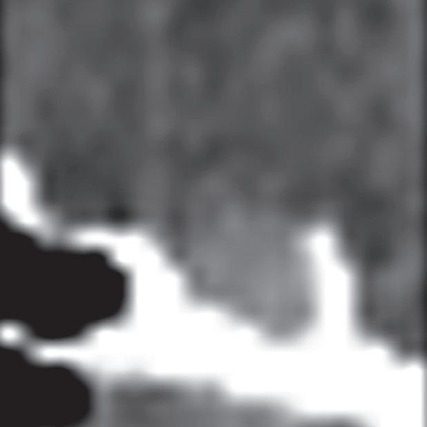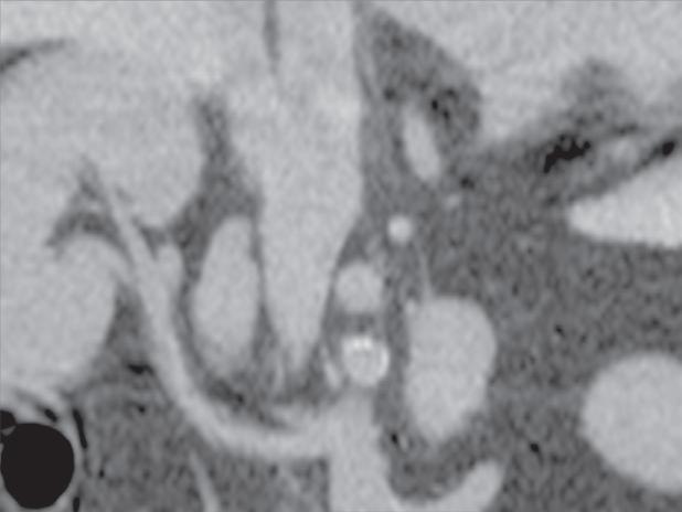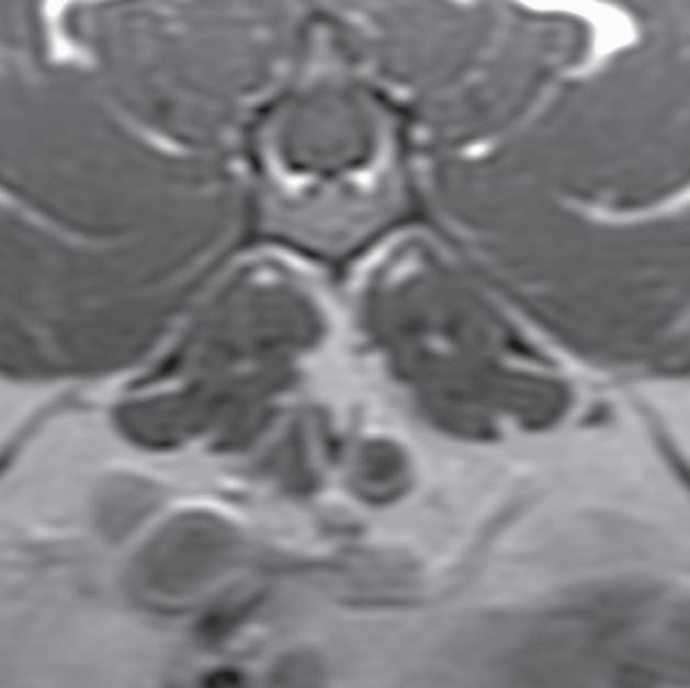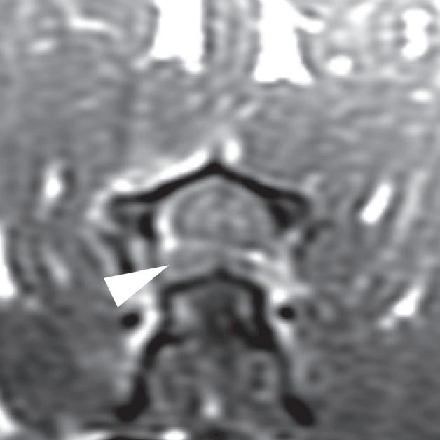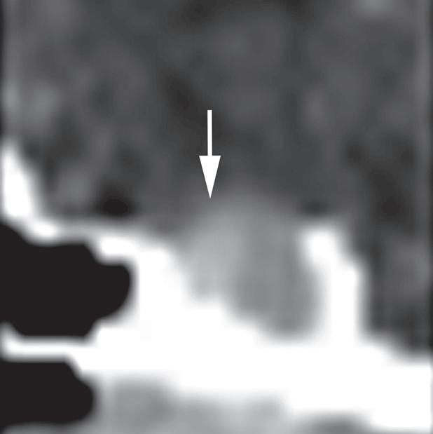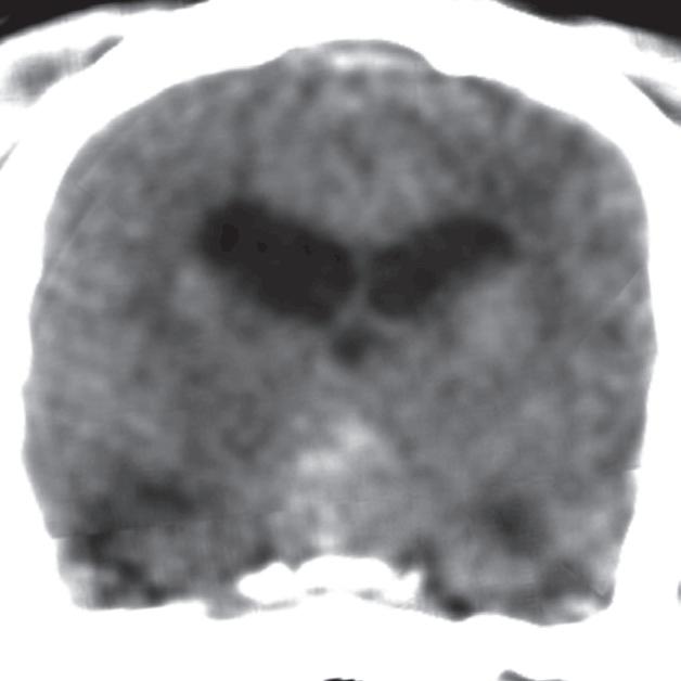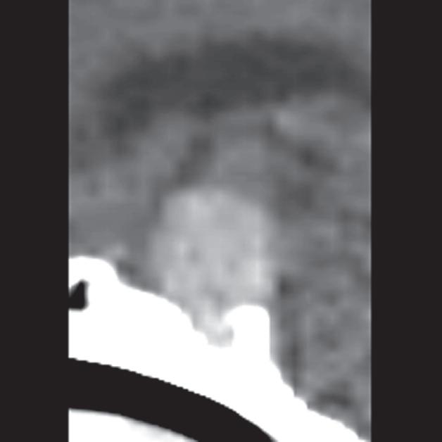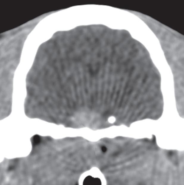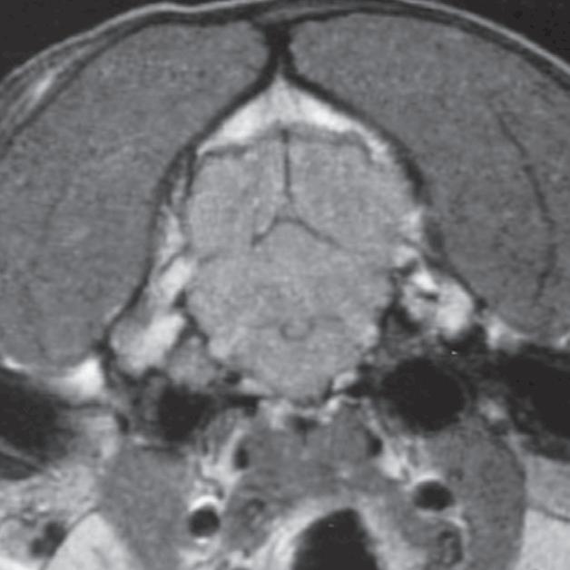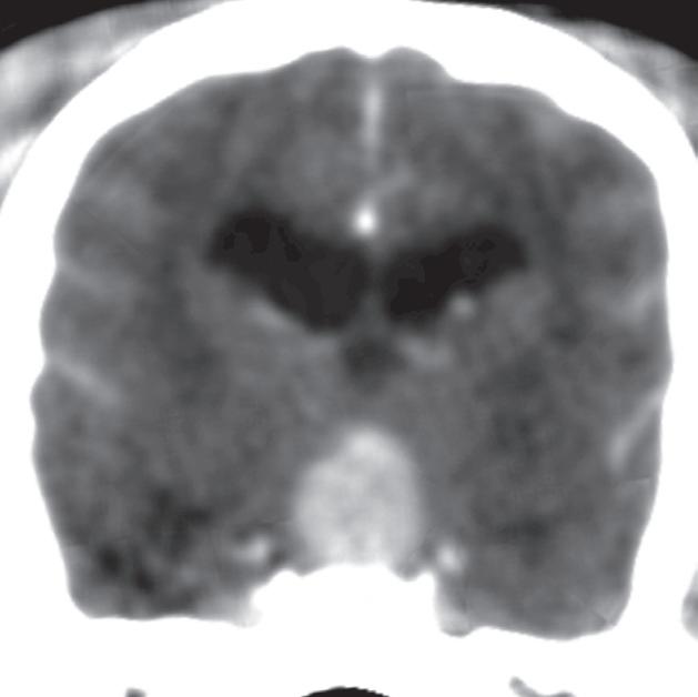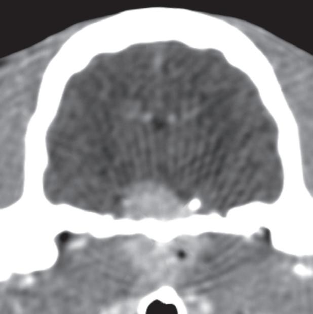 (b) CT+C, TP Badanie wykonano u 8-letniej, kastrowanej samicy jamnika z potwierdzoną nadczynnością kory nadnerczy zależną od przysadki. Ryciny a i b to reprezentatywne obrazy w płaszczyźnie poprzecznej na poziomie przysadki. Rycina c jest powiększonym obrazem dołu przysadki. W badaniu bez podania środka kontrastowego (a) uwidoczniono słabo odgraniczoną, częściowo zmineralizowaną masę zlokalizowaną w okolicy przysadkowo-podwzgórzowej. Masa uległa jednorodnemu wzmocnieniu kontrastowemu i miała wymiary 11 mm (wysokość) na 10 mm (szerokość). Dane z wywiadu, objawy kliniczne oraz wyniki testu hamowania małą dawką deksametazonu wskazywały na zależną od przysadki nadczynność kory nadnerczy