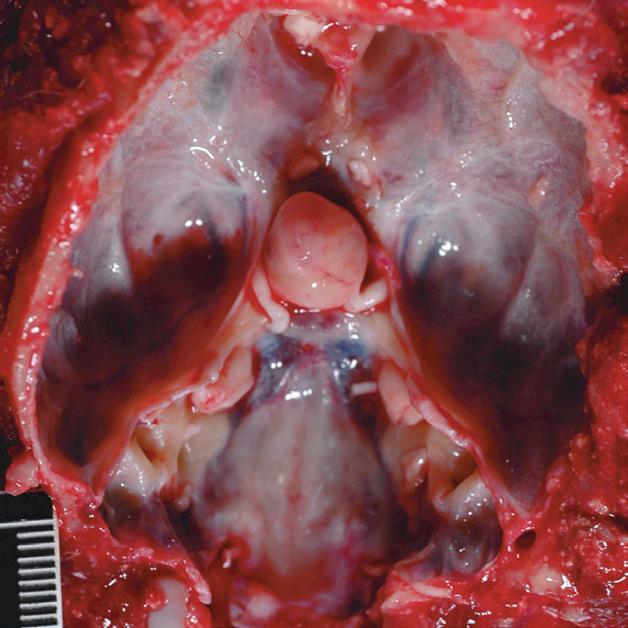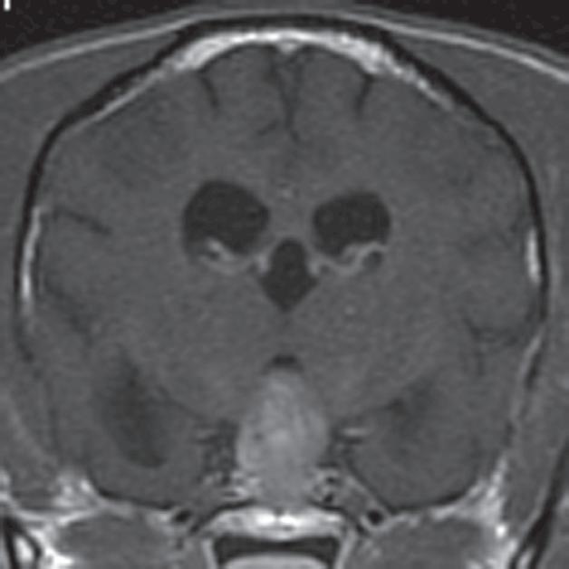 Badanie wykonano u 14-letniej, kastrowanej samicy szpica z przechyleniem głowy i występującym od niedawna chodzeniem w kółko w prawą stronę. Ryciny a–c to reprezentatywne obrazy w płaszczyźnie poprzecznej na poziomie dołu przysadki. Ryciny d–f to analogiczne obrazy w płaszczyźnie strzałkowej. Przysadka mózgowa była znacznie powiększona (wysokość = 10 mm, szerokość = 10 mm), izointensywna w obrazach T1-zależnych (a, d) i łagodnie hiperintensywna w obrazach T2-zależnych (b, e) w porównaniu z istotą szarą głęboką. Stwierdzono również poszerzenie układu komorowego (wentrikulomegalię), które może wynikać z częściowej niedrożności. Przysadka uległa jednorodnemu wzmocnieniu kontrastowemu (c, f), a w badaniu pośmiertnym wykazano, że miała postać dobrze odgraniczonej, kulistej masy (g). Potwierdzono, że zmiana była makrogruczolakiem przysadki