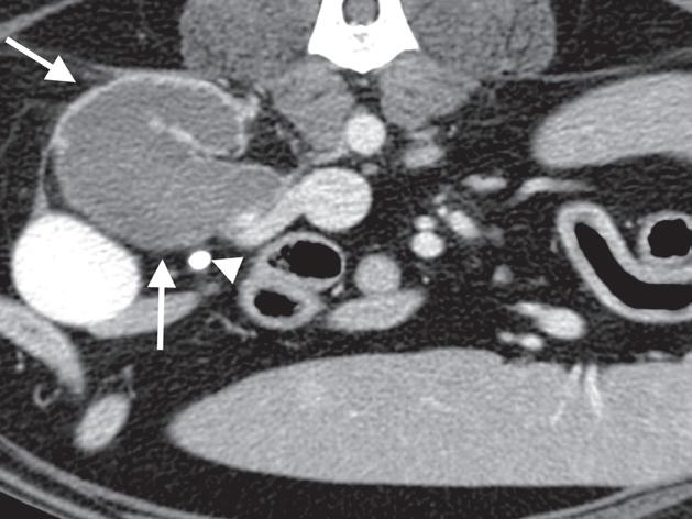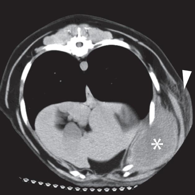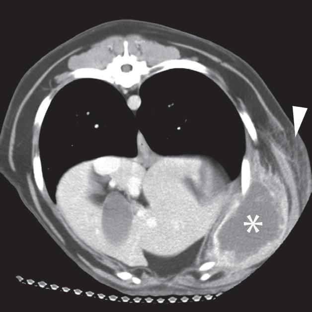 Badanie wykonano u 6-letniego, kastrowanego golden retrievera z fluktującą masą po lewej stronie w dobrzusznej części ściany klatki piersiowej. Radiogram grzbietowo-brzuszny (DV) klatki piersiowej uwidocznił dużą masę miękkotkankową wystającą z lewej ściany klatki piersiowej (a). Duża, jajowata masa jest widoczna na lewej brzusznej ścianie powłok. Jest ona głęboko położona w stosunku do zewnętrznych mięśni skośnych brzucha i wkracza przyśrodkowo do krawędzi żeber (b, c – gwiazdka). Część centralna ma około 15 HU zarówno na niewzmocnionych, jak i wzmocnionych obrazach TK (b, c), a masa ma gruby, obwodowo wzmacniający się rąbek (c). Widać również objawy bardziej powierzchownego, rozlanego zapalenia tkanki łącznej (cellulitis) (b, c – grot strzałki). Masę usunięto chirurgicznie i potwierdzono, że zawierała materiał ropny