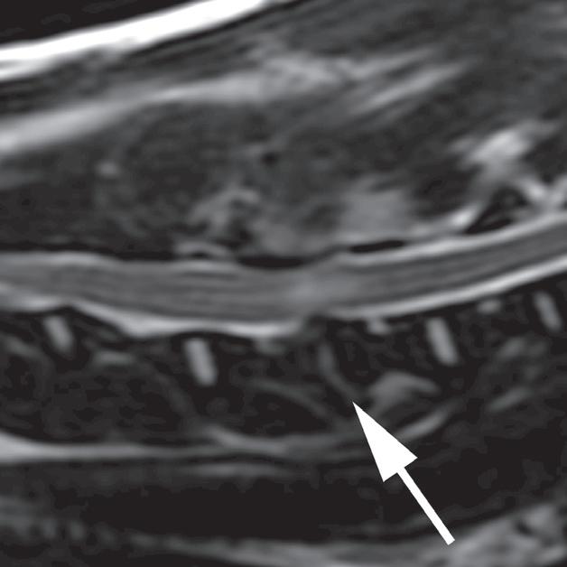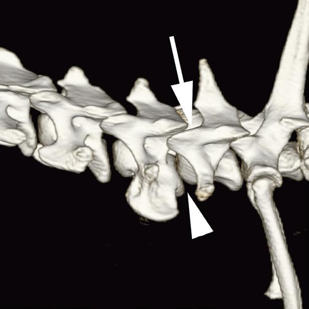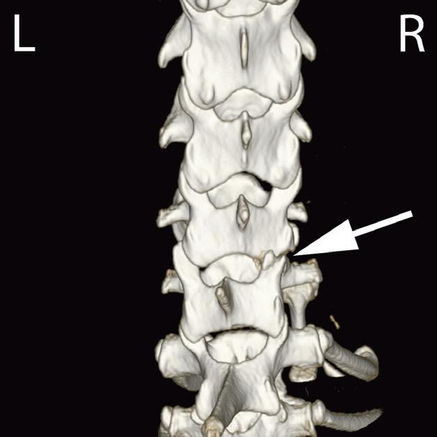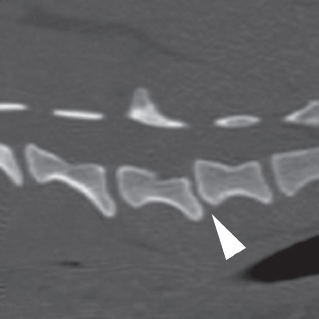 Badania wykonano u 5-letniej samicy mieszańca w typie teriera, która została pogryziona w okolicy szyjnej przez większego psa tego samego dnia, w którym wykonano badania. Podczas wizyty u psa zaobserwowano deficyty neurologiczne z neuroanatomiczną lokalizacją w obrębie C6–T2. Radiogramy przeglądowe ukazały grzbietowe podwichnięcie kręgu C7 względem C6 oraz zwężenie przestrzeni międzykręgowej C6–C7 (a – grot strzałki). Podobne zmiany uwidoczniono na obrazach TK w projekcji strzałkowej i 3D (b, f – grot strzałki). Dodatkowo stwierdzono wieloodłamowe złamanie z przemieszczeniem prawego doczaszkowego wyrostka stawowego kręgu C7 (c–e – strzałka). Dla porównania przedstawiono prawidłowy lewy wyrostek stawowy (f – strzałka). W badaniu MR przestrzeń międzykręgowa C6–C7 była zwężona i wykazywała obniżoną intensywność sygnału w obrazach T2-zależnych (i – strzałka), a przemieszczony materiał dyskowy znajdował się w prawej dobrzusznej części kanału kręgowego (g, h – grot strzałki). W obrazach występują cechy ucisku na rdzeń kręgowy (g–i) oraz zwiększona intensywność sygnału w sekwencji T2-zależnej w obrębie rdzenia na poziomie C6–C7 (h, i), co wskazuje na jego uszkodzenie wewnętrzne. Materiał dyskowy został chirurgicznie usunięty z kanału kręgowego, a podwichnięcie zredukowano i ustabilizowano operacyjnie