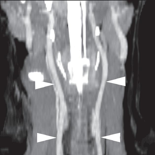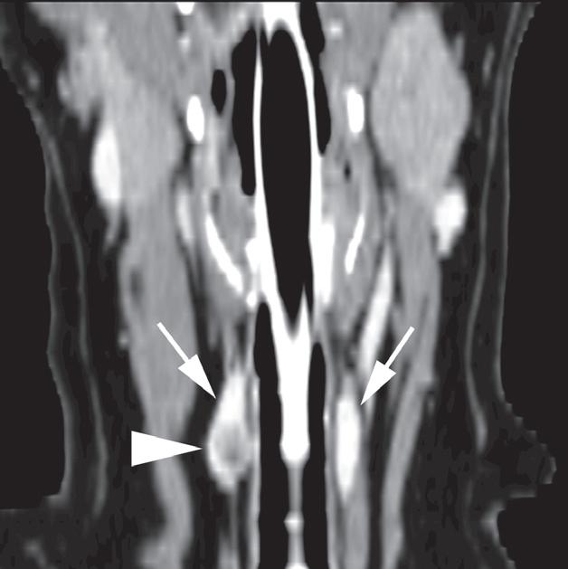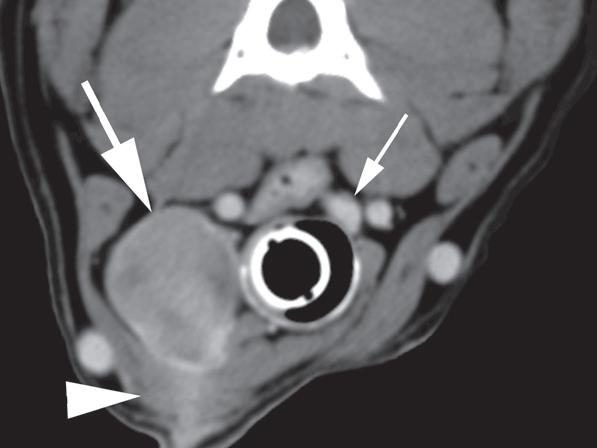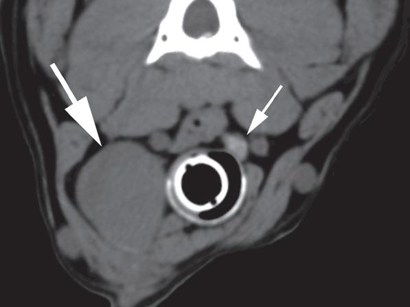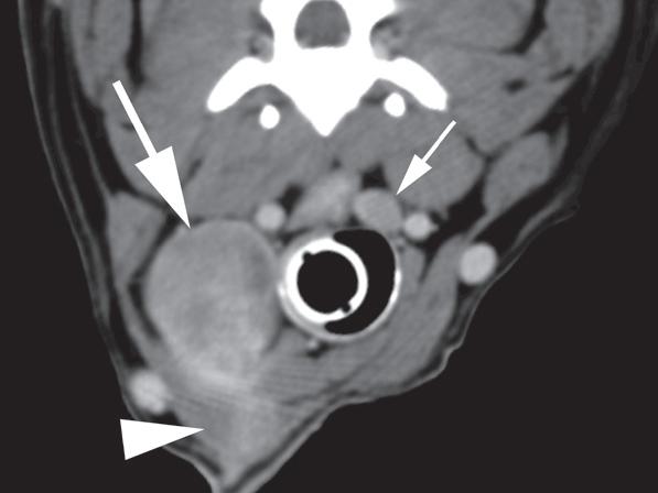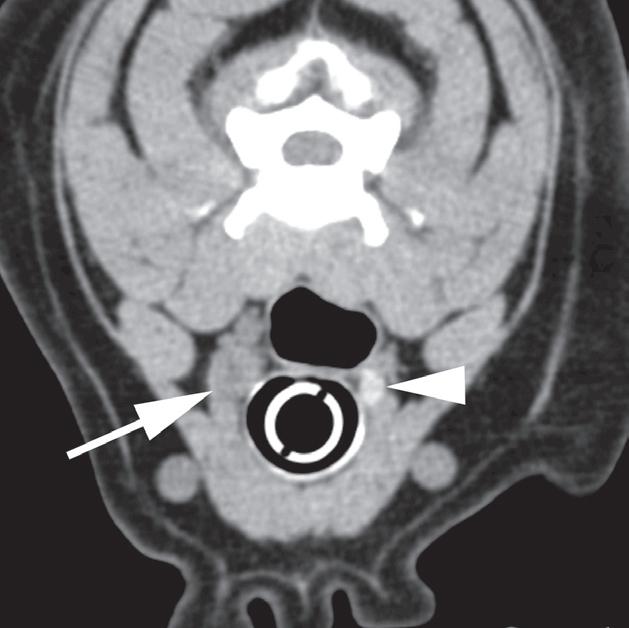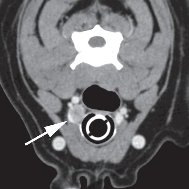 Badanie wykonano u 12-letniej, kastrowanej samicy labradora retrievera z wcześniej zdiagnozowanymi masami płucnymi i szyjnymi. W badaniu USG uwidoczniono kulisty, hipoechogeniczny guzek w obrębie prawego płata tarczycy (a). W TK masa jest nieznacznie hipodensyjna w obrazach bez wzmocnienia (b – strzałka). Lewy płat tarczycy ma prawidłową wielkość i jest hiperdensyjny (b – grot strzałki). Masa ulega umiarkowanemu wzmocnieniu po podaniu środka kontrastowego, jednak w mniejszym stopniu niż sąsiedni prawidłowy miąższ tarczycy (c – strzałka) i jej przeciwległy płat. W obrazach w rekonstrukcji grzbietowej w projekcji MIP po podaniu środka kontrastowego uwidoczniono przebieg obu tętnic szyjnych wspólnych dogrzbietowo względem płatów tarczycy (d – groty strzałek). Cieńszy przekrój MIP wykluczający tętnice szyjne ukazuje płaty tarczycy (e – strzałki) oraz lokalizację masy w obrębie prawego płata (e – grot strzałki). Biopsja wycinkowa wykazała raka tarczycy o utkaniu litym i pęcherzykowym z naciekaniem naczyń i torebki