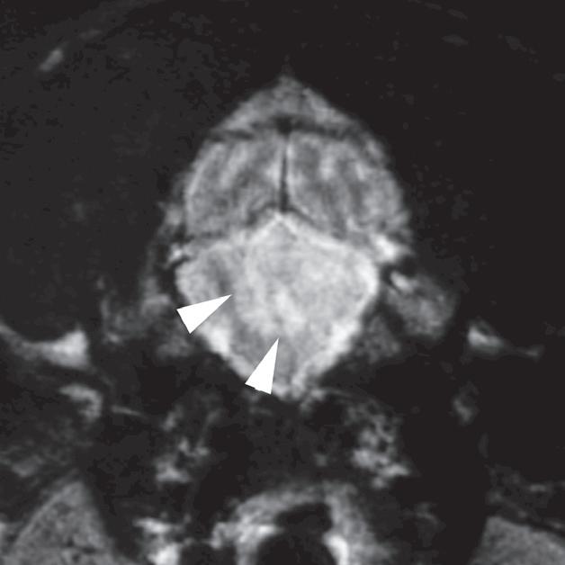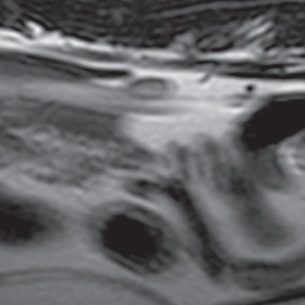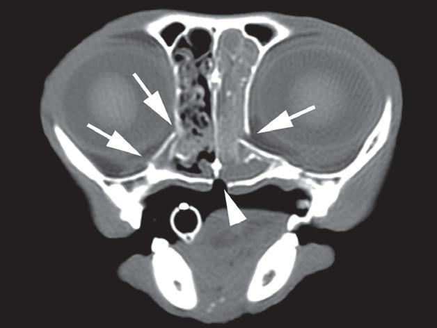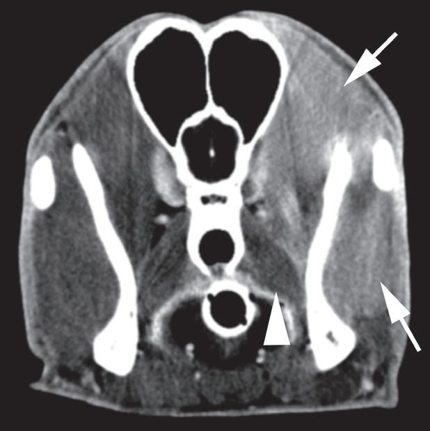 Badanie wykonano u 1,5-rocznego, kastrowanego rottweilera z szybko postępującym brakiem możliwości otwierania pyska. Prezentowane obrazy TK wykonano bezpośrednio po podaniu środka kontrastowego. Widoczne jest umiarkowane, rozlane wzmocnienie pokontrastowe mięśni żwacza i skroniowego po lewej stronie (a, b – strzałki).