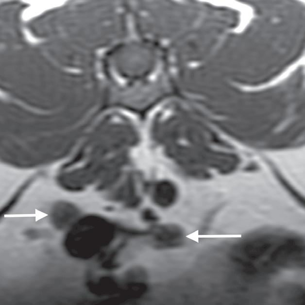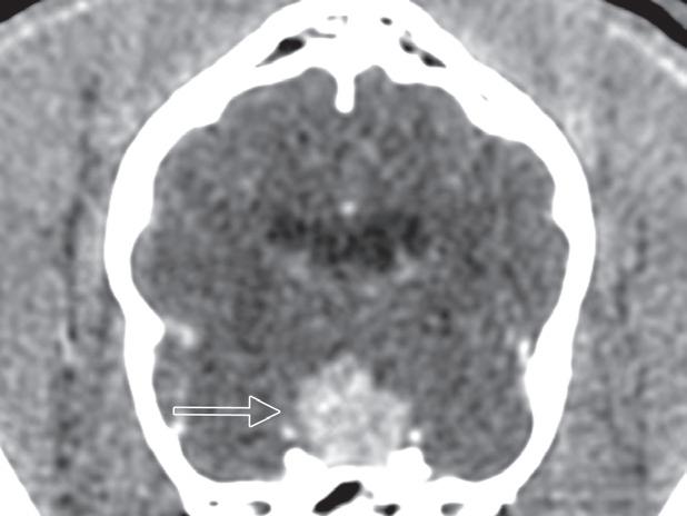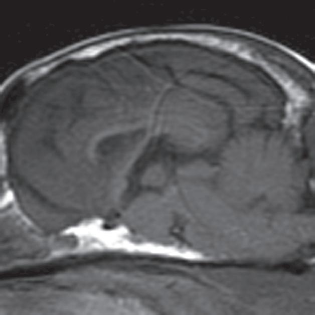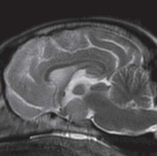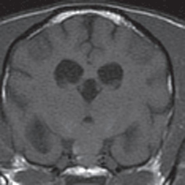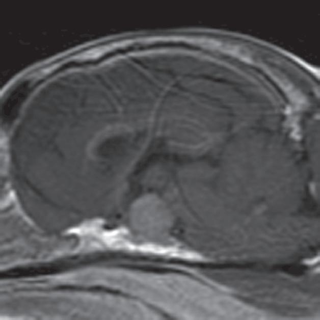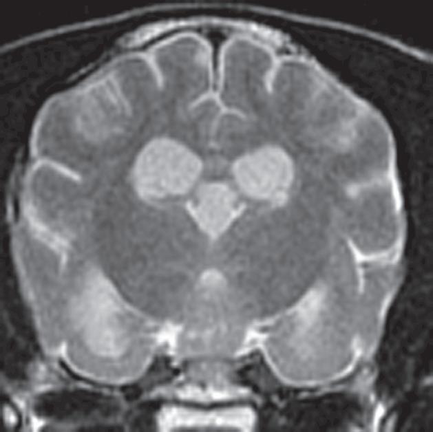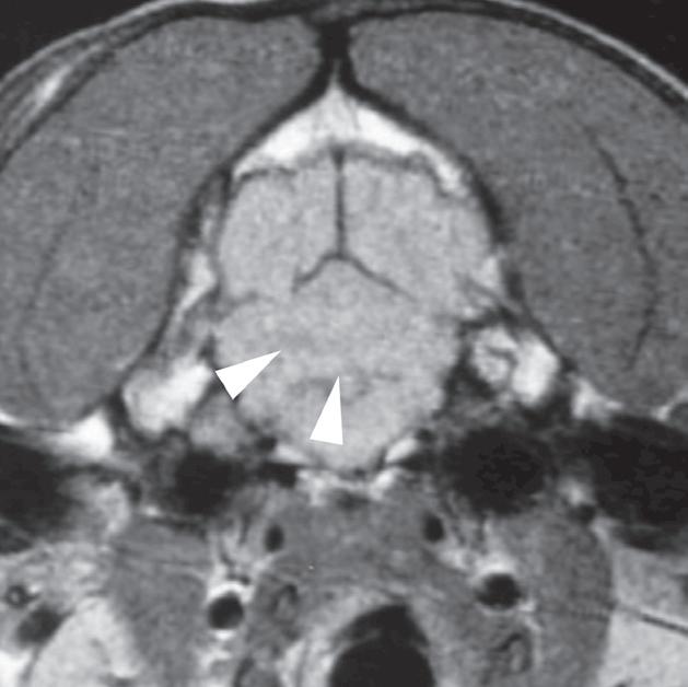 U 6-letniego samca rasy rhodesian ridgeback od 4 dni obserwowano objawy wskazujące na chorobę móżdżku. Stwierdzono słabo odgraniczony, izointensywny w T1 i hiperintensywny w T2 obszar w robaku i lewej półkuli móżdżku (a, b – groty strzałek), któremu nie towarzyszył żaden znaczący efekt masy. Po podaniu kontrastu nie zobrazowano wzmocnienia zmiany. Test immunofluorescencji pośredniej (IFA) wykazał miano zgodne z aktywnym zakażeniem Neospora. Badanie pośmiertne wykonane ok. 3 miesięcy po wstępnym rozpoznaniu potwierdziło martwicze, ziarniniakowe zapalenie móżdżku z pierwotniakami odpowiadającymi Neospora wewnątrz ognisk