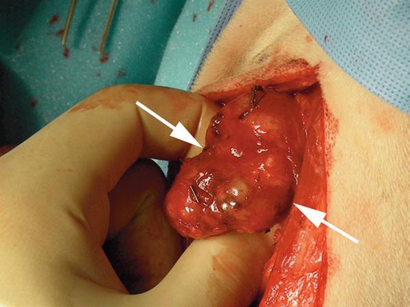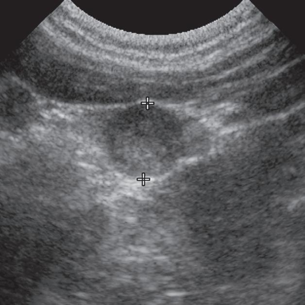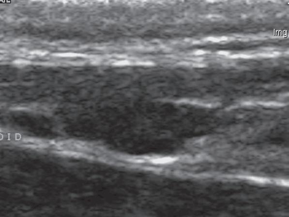 Badanie wykonano u 12-letniej, kastrowanej samicy owczarka australijskiego z prawostronną masą w dobrzusznej części szyi. Badanie USG wykazało dużą, litą, unaczynioną masę w obrębie prawego płata tarczycy (a) oraz mniejszą, hipoechogeniczną masę w obrębie lewego płata (b). Obrazy TK przed i po podaniu środka kontrastowego (c–f) ułożone od doczaszkowych do doogonowych ukazują dużą, prawostronną, jednorodnie wzmacniającą się masę (c–f – duża strzałka) z niewyraźną granicą dobrzuszną oraz pozatorebkowym szerzeniem się i rozlanym wzmocnieniem pokontrastowym przyległych tkanek (e, f – grot strzałki). W obrazie bardziej doczaszkowym widoczny jest prawidłowy lewy płat (c, e – mała strzałka), natomiast w obrazie bardziej doogonowym jest on powiększony i ma niższą gęstość, niż można by oczekiwać, co sugeruje obecność drugiej, mniejszej masy (d, f – mała strzałka). W obrazach reformowanych wzdłuż osi długiej widać dwa małe guzki w lewym płacie (h – małe strzałki). Wyniki obrazowe potwierdzono podczas zabiegu (i, j – strzałki). Biopsja wycinkowa wykazała prawostronnego raka tarczycy z naciekaniem pozatorebkowym oraz lewostronnego gruczolaka tarczycy