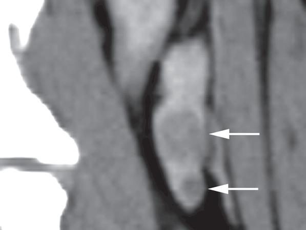 Badanie wykonano u 8-letniej, kastrowanej samicy kota syjamskiego z potwierdzoną akromegalią i cukrzycą. Ryciny a i b przedstawiają obrazy w płaszczyźnie poprzecznej wykonane na poziomie przysadki. Ryciny c i d to powiększone obrazy dołu przysadki. W badaniu bez podania środka kontrastowego, w rzucie przysadki, uwidoczniono łagodnie asymetryczną masę o wysokiej atenuacji (a, c). Masa uległa umiarkowanemu i niejednorodnemu wzmocnieniu po podaniu kontrastu, przy czym wzmocnienie było bardziej nasilone donosowo (d – strzałka). Masa miała 6 mm wysokości i 6 mm głębokości, a jej brzeg grzbietowy był wypukły i wykraczał poza grzbietowy obrys siodła tureckiego. Badanie pośmiertne potwierdziło obecność gruczolaka części pośredniej