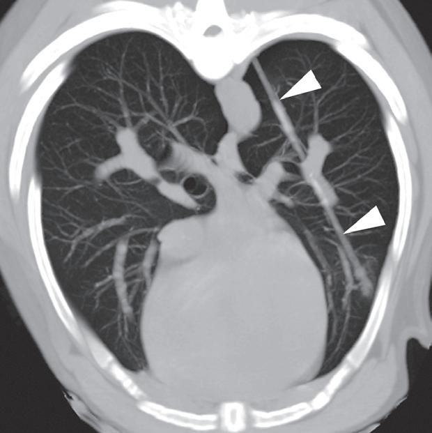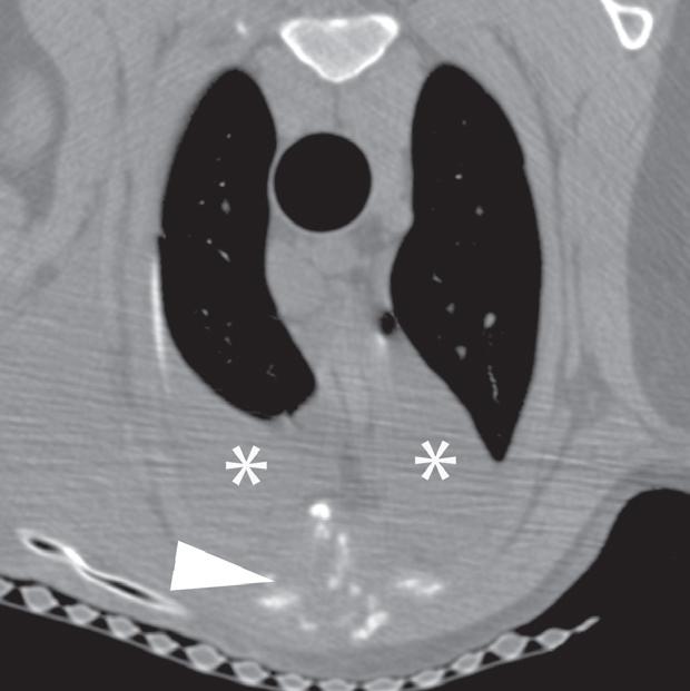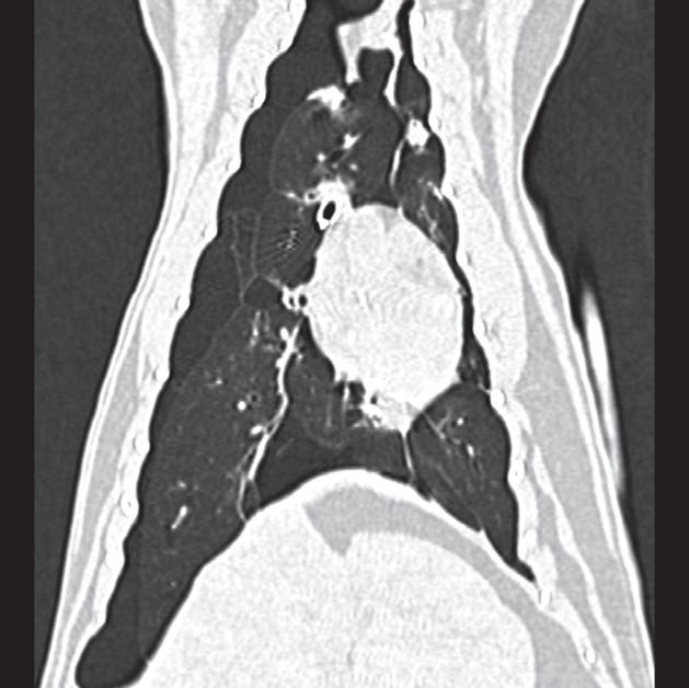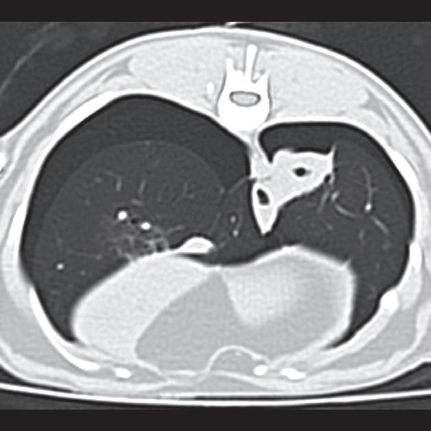 Badanie wykonano u 4-letniego, kastrowanego samca kota abisyńskiego z przewlekłą chorobą układu oddechowego. Obrazy na ryc. a i b są reprezentatywnymi skolimowanymi co 1 mm skanami poprzecznymi środkowej części klatki piersiowej wykonanymi na poziomie oskrzela płatowego lewego płata doczaszkowego (a) i prawego środkowego płuc (b). Obraz na ryc. c jest skośnym obrazem zrekonstruowanym w osi długiej, ukazującym prawy płat środkowy płuc. Lewe doczaszkowe oskrzele płatowe jest wypełnione powietrzem i ma prawidłowe położenie (a – strzałka), jednak płat płuca ma zmniejszoną objętość i zwiększoną atenuację z powodu niedodmy (a – groty strzałek). Podobne zmiany zaobserwowano w przypadku oskrzela płata prawego pośrodkowego płuc (b, c – strzałki) i płuca (b, c – groty strzałek). Obraz skośny wyraźnie ukazuje przebieg oskrzela prawego pośrodkowego płata płuc (c – strzałka). Pośrednia atenuacja okalająca niedodmowy prawy pośrodkowy płat płuca to tłuszcz opłucnowy/osierdziowy. W tym przypadku niedodma wielopłatowa rozwinęła się wtórnie do przewlekłego zapalenia płuc. Posiewy z wydzieliny oskrzelowej potwierdziły rozpoznanie zapalenia płuc wywołanego przez Mycoplasma pneumoniae