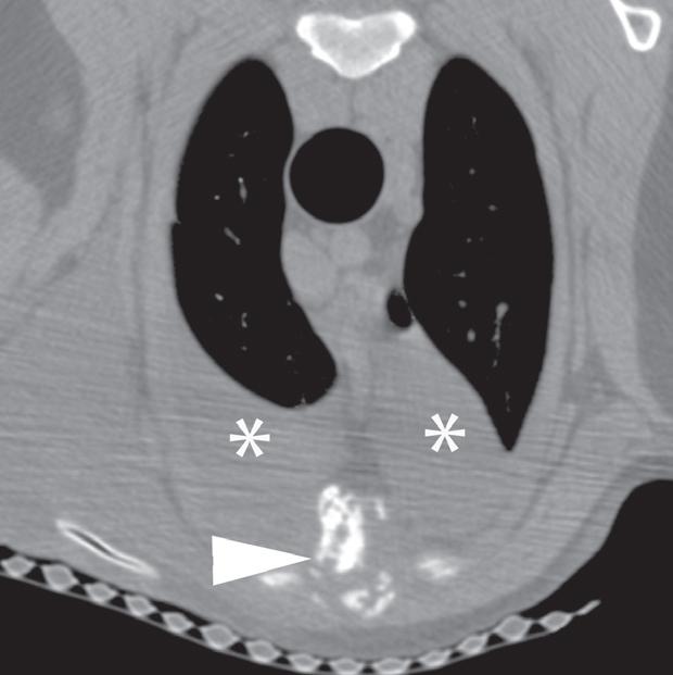 Badanie wykonano u dorosłego, kastrowanego kota domowego krótkowłosego z występującym od kilku miesięcy kaszlem i utratą masy ciała. W ostatnim czasie u pacjenta obserwowano postępujący wysiłek oddechowy. Poprzeczne obrazy TK skupione na dwóch kolejnych żebrach, widoczne od doczaszkowego do doogonowego, ukazują w części bliższej przemieszczone lewostronne złamania (a, b – duże groty strzałek). Oba złamania są minimalnie przemieszczone i mają widoczne proliferacyjne zmiany, niełączące jeszcze odłamów kostnych. Złamania dotyczą sześciu kolejnych żeber po lewej stronie (c). Zmiany w płucach obejmowały znacznego stopnia, uogólniony odczyn okołooskrzelowy (a, b), niedodmę i konsolidację płata dodatkowego płuc (b – strzałka) oraz rozstrzeń oskrzeli (a, b – małe groty strzałek). Popłuczyny oskrzelowo-pęcherzykowe (BAL) wykazały ropne zapalenie, wyhodowano szczep Mycoplasma. Założono, że złamania były wynikiem cyklicznych urazów przeciążeniowych, spowodowanych przedłużonym zwiększonym wysiłkiem oddechowym