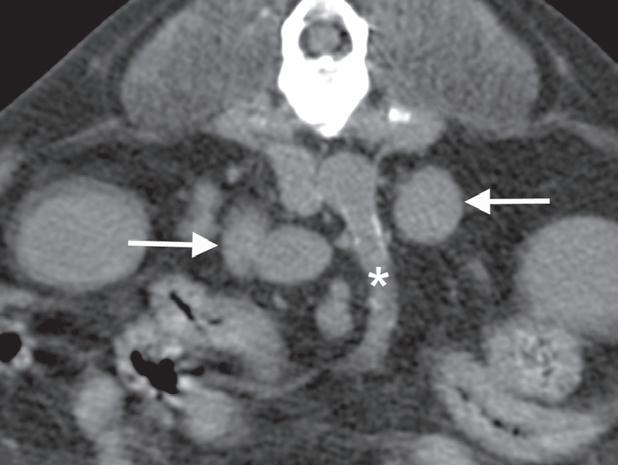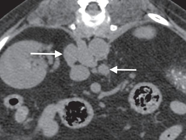Badanie wykonano u 12-letniego, kastrowanego boston teriera z podejrzeniem przysadkowozależnej nadczynności kory nadnerczy. W badaniu natywnym oba nadnercza (a, b – strzałki) są powiększone i zaokrąglone, a także wykazują jednorodną densyjność tkanek miękkich. Widoczna jest mineralizacja ściany tętnicy krezkowej przedniej, która jest zmianą wtórną do zespołu Cushinga (b – gwiazdka). Obraz po podaniu dożylnego środka kontrastowego mózgowia ujawnia duży, intensywnie wzmacniający się rozrost przysadki (d – otwarta strzałka), przypuszczalnie o charakterze funkcjonalnym