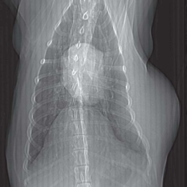 Badanie wykonano u 13-letniego foksteriera z pojedynczym gruczolakorakiem płuc (nie ukazano na rycinie).