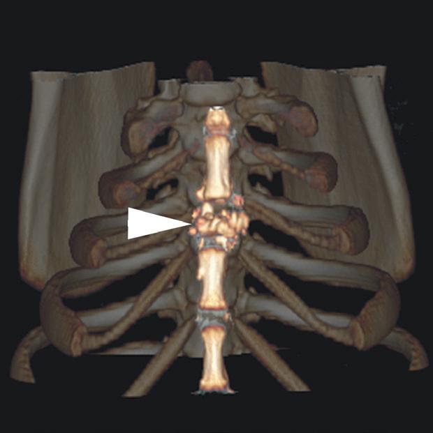 Badanie wykonano u 18-miesięcznego, kastrowanego samca dobermana. Ryciny a i b przedstawiają kolejne obrazy poprzeczne doczaszkowej części klatki piersiowej w orientacji doczaszkowo-doogonowej. Widoczne jest nieuorganizowane niszczenie kości obejmujące drugi segment mostka (a–d – grot strzałki). Obecne jest również złamanie patologiczne (c – grot strzałki). Obustronnie widać umiarkowaną ilość płynu w jamie opłucnej w zgodnej grawitacyjnie przestrzeni opłucnowej (a, b – gwiazdki). Biopsja kości potwierdziła przewlekłe neutrofilowe zapalenie kości i szpiku, a cytologia płynu opłucnowego wykazała obecność zapalenia ropnego