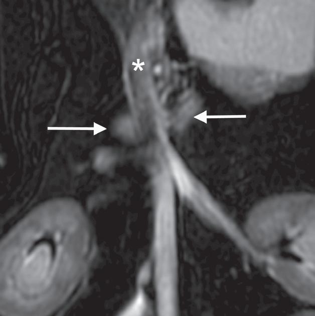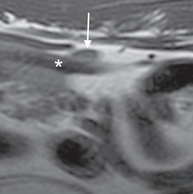 Badanie wykonano u 4-letniej samicy kota europejskiego krótkowłosego. Nadnercza są izointensywne względem mięśni na obrazach T1-zależnych (a – strzałki) i wykazują wyraźne wzmocnienie po podaniu środka kontrastowego (b). Na obrazach T2-zależnych są nieznacznie hiperintensywne w porównaniu do mięśni (c). Gruczoły mają kształt owalny (d, f – strzałki) i są położone grzbietowo i bocznie względem żyły głównej doogonowej (d, f – gwiazdka)