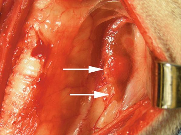 Wydaje się, że mięśnie skrzydłowe są niezmienione (a, b – grot strzałki).