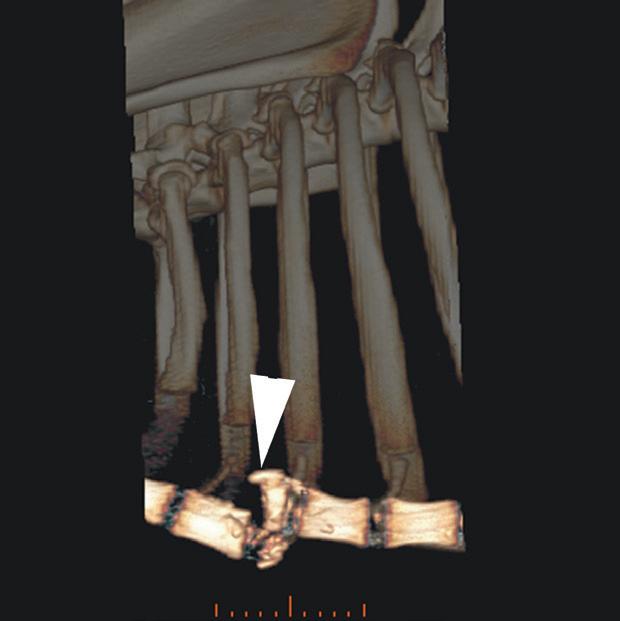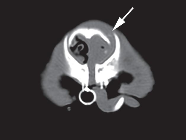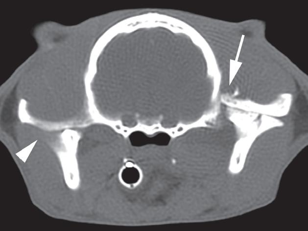 Badanie wykonano u 5-letniego, kastrowanego kota rasy europejskiej po urazie o nieznanej przyczynie, do którego doszło w ciągu 48 godzin poprzedzających badanie. U kota stwierdzono liczne złamania czaszki typowe dla urazów o dużej sile. Prezentowane obrazy ułożono w kolejności od donosowej do doogonowej. Urazy obejmują: złamanie lub zwichnięcie w obrębie kości nosowych i szczękowych (a – strzałka), separacje spojenia żuchwy (b – strzałka), złamania wyrostków pionowych kości podniebiennych (c – strzałki), rozejście spojenia podniebiennego (c – grot strzałki), złamania kości skrzydłowych (d – strzałki), doogonowe zwichnięcie prawego wyrostka kłykciowego (e – grot strzałki) oraz złamanie przez wyrostek jarzmowy lewej kości skroniowej (e – strzałka)