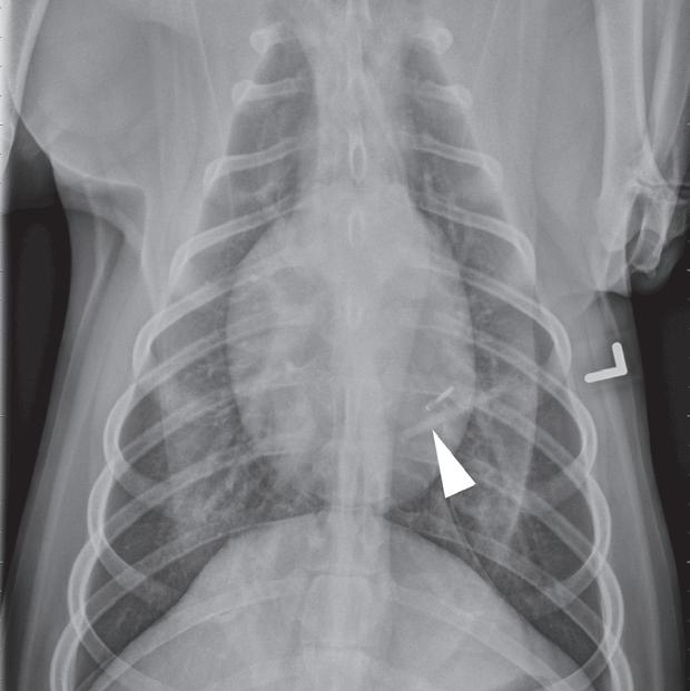 Badanie wykonano u 5-letniej, kastrowanej samicy mieszańca pointera, u której 5 miesięcy przed badaniem wystąpił nagły epizod kaszlu podczas spaceru. Właściciele zauważyli wówczas małą otwartą ranę w ścianie klatki piersiowej. Obecnie od 5 dni u psa występują duszności. Na zdjęciach rentgenowskich widoczne jest krótkie, linijne zacienienie o atenuacji zbliżonej do tkanek miękkich, znajdujące się w rejonie lewego doogonowego płata płuc (a – grot strzałki). Na poprzecznych obrazach TK uwidoczniono linijne ciało obce o atenuacji miękkotkankowej (b – strzałka) oraz niewielką odmę opłucnową (b – grot strzałki). Całkowitą długość ciała obcego można najlepiej ocenić na obrazie MIP zorientowanym w płaszczyźnie poprzecznej (c – groty strzałek). Ciało obce usunięto poprzez torakotomię (d – strzałka) i ustalono, że był to pręt z włókna węglowego lub plastiku, na który pies nadział się 5 miesięcy wcześniej