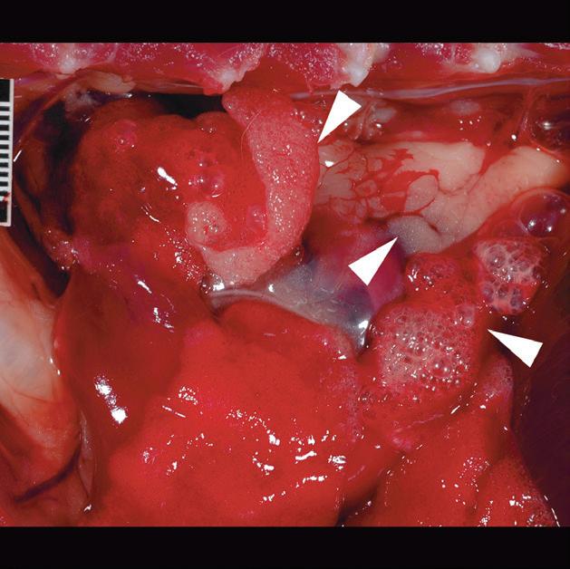 Badanie wykonano u 1,5-rocznego kota domowego krótkowłosego z niewydolnością oddechową oraz wstępnym rozpoznaniem odmy opłucnowej na podstawie badania radiograficznego. Stwierdzono obustronną odmę opłucnową i liczne ogniska niedodmy. Powietrzne płuco wydaje się nieco bardziej przejrzyste, niż oczekiwano, biorąc pod uwagę nasilenie odmy opłucnowej, a atenuacja miąższu obwodowego wynosi średnio mniej niż –925 HU. Na obrazach TK nie uwidoczniono innych specyficznych cech morfologicznych rozedmy płuc, jednak makroskopowy obraz sekcyjny płuc wyraźnie wskazywał na rozedmę i obecność pęcherzy rozedmowych w wielu płatach płuc (c – groty strzałek). Zmiany mikroskopowe były zgodne z wrodzoną dysplazją oskrzelikową, która w terminalnej fazie prowadzi do rozwoju rozedmy i powstania pęcherzy rozedmowych