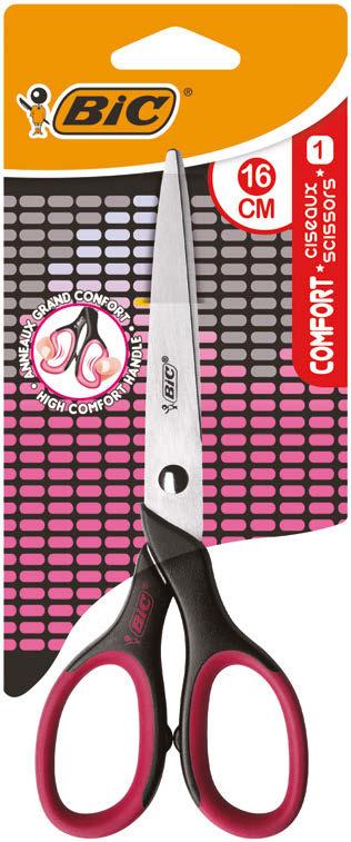 Poręczne i trwałe nożyczki o długości 16 cm zostały idealnie dopasowane do dłoni uczniów i licealistów. Dzięki miękkim, lekkim uchwytom zapewniają wysoki komfort podczas cięcia. Stalowe ostrza są wytrzymałe i zachowują ostrość przez długi czas, co pozwala na wielokrotne użytkowanie produktu i mnóstwo kreatywnej aktywności. Dostępne w atrakcyjnych wersjach kolorystycznych: czarno-niebieskiej i czarno-różowej oraz z dwoma wariantami graficznych dekorów na ostrzu. Z nożyczkami BIC Comfort cięcie jest dziecinnie proste. Dokonały wybór na lata.