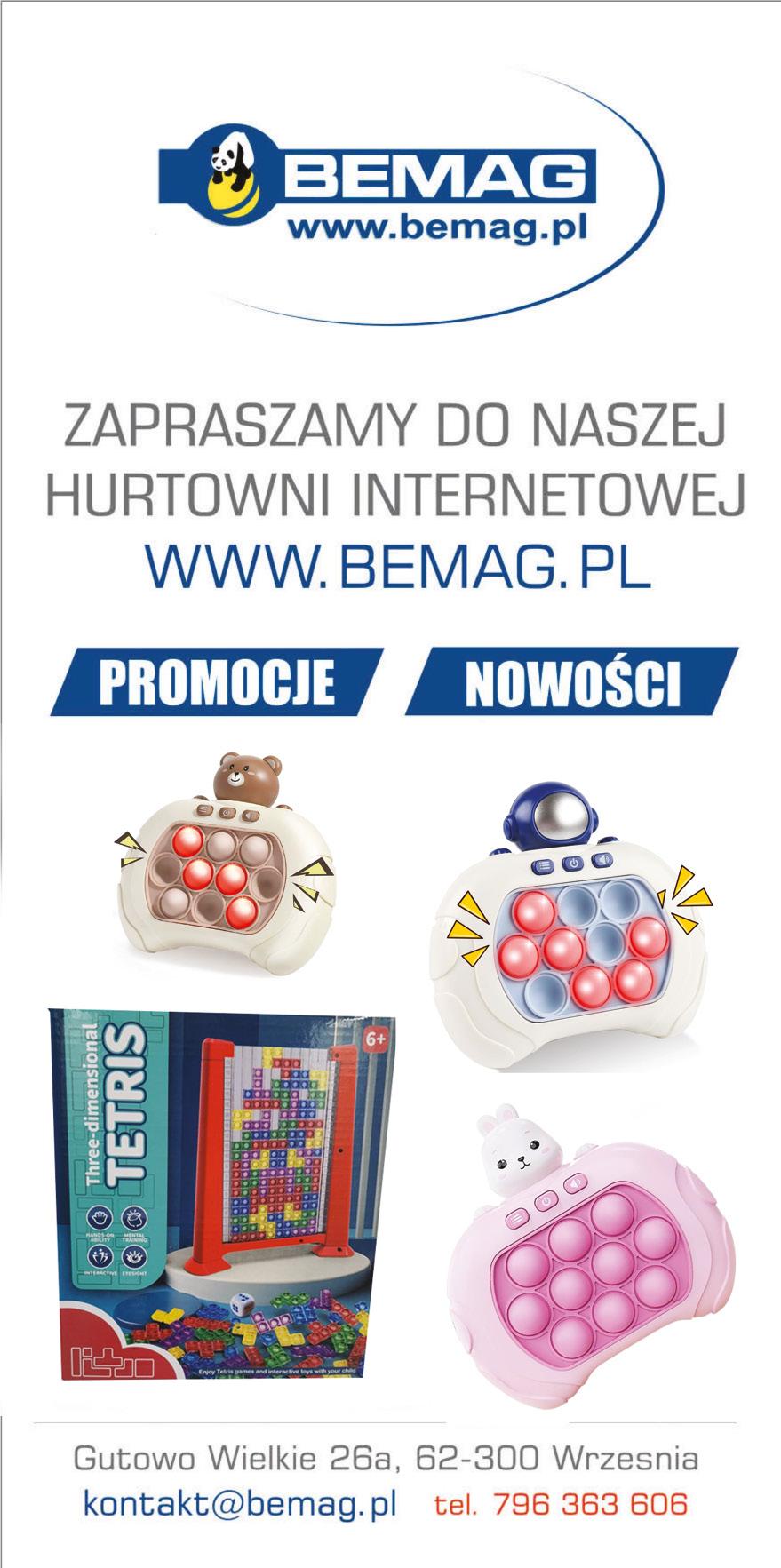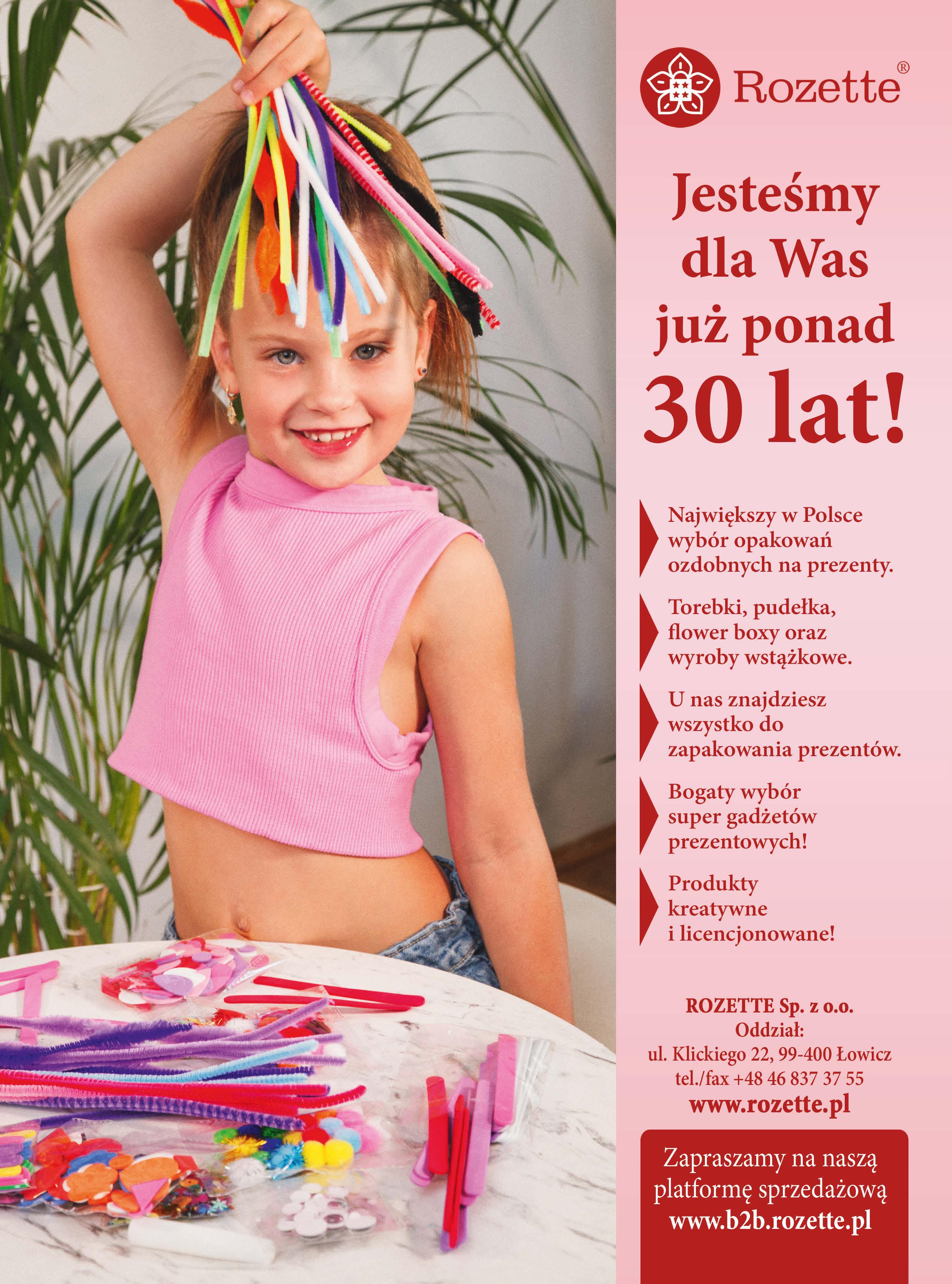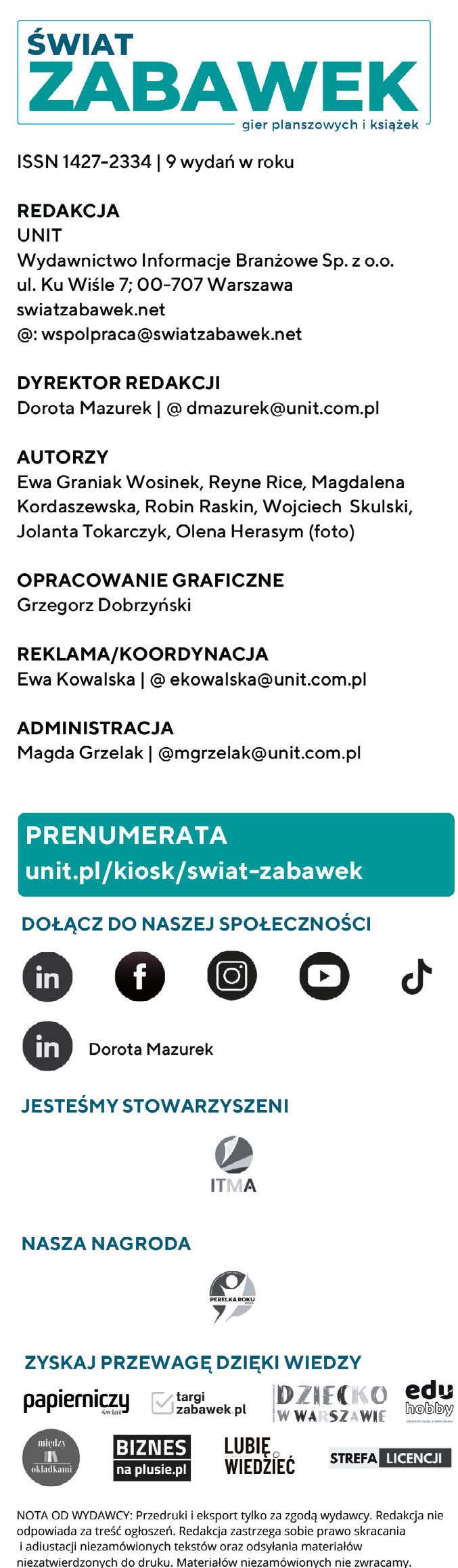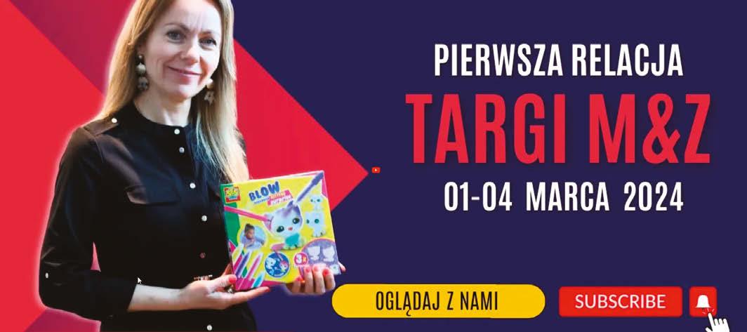 Proste zasady i moc zabawy – IUVI Games 6 Bałagany – Muduko 8 Wychowanie dzieci wg Japończyków 10 Torby i pudełka ozdobne – Rozette 12 Maximum zabawy pojazdami od WADER Woźniak 14 Jak wybrać idealną lalkę dla klienta – Bayer Design 20 Gram Sam – Kapitan Nauka 24 Tajemnice Różańca – Jawa 31 Gry, kolorowanki… - Rozette 32 Nowe strony – REBEL 36 Świat Przyjazny Dziecku – XXII edycja, laureaci 38 L.O.L. Surprise O.M.G. Sweet Nails 44 Klasyki ponownie w ofercie Granny 46 EMI i jej tajny klub 46 Klocki Fest – Targi Kielce 46 50 lat wyobraźni 56 LEGO Dungeons&Dragons 57 Nowości 58 BIZNES Targi KIDS Time – relacja 16 Do 2026 nie otworzy się żadna nowa, duża galeria 28 Zetki ruszyły na zakupy 29 Chcemy znać prawa konsumenckie 52 Uprzedzenia ograniczają kreatywność – badania LEGO 54