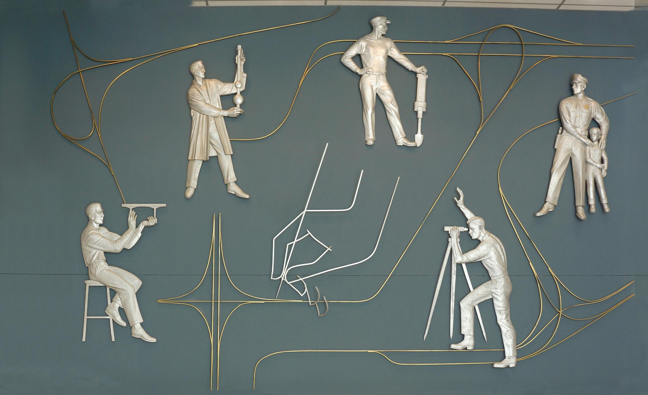 The large sculpture depicts different engineers at work and a Wyoming Highway Patrol trooper protecting a child, all connected via various aerial views of intersection designs.