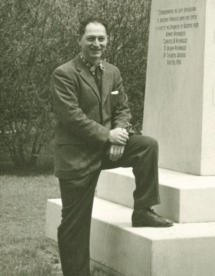 Robert Russin standing next to the base of the Ben Franklin statue on the UW campus, 1956.