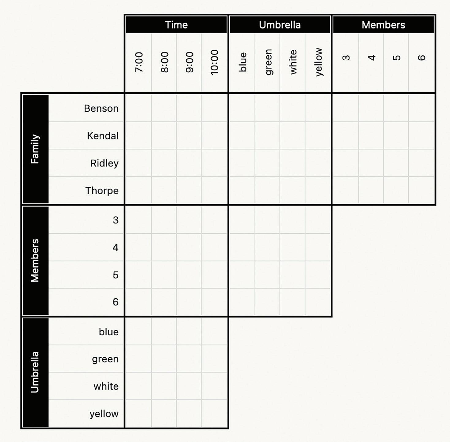 2. Family Thorpe arrived at the beach one hour after the family with the blue umbrella, and one hour earlier than the largest family.