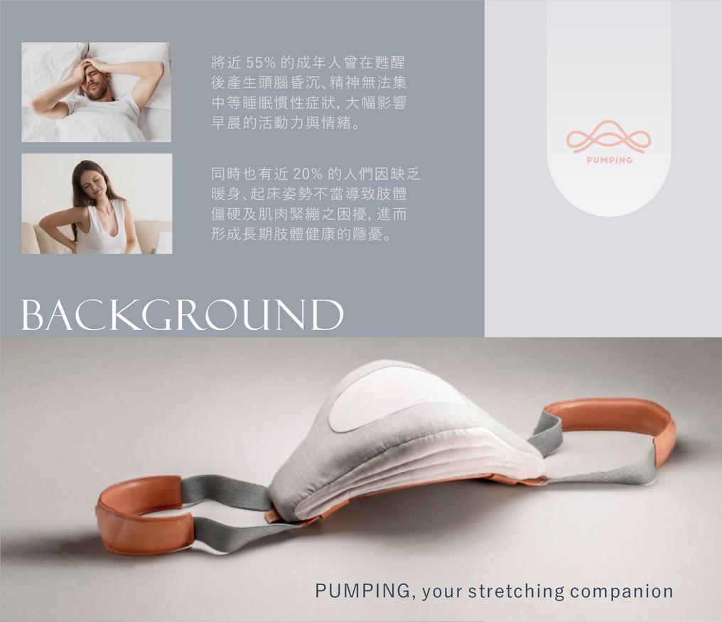 PUMPING is a physical stretching aid that caters to the needs of modern-day individuals who struggle with morning grogginess and body stiffness. In collaboration with physical therapists from "Taipei Veterans General Hospital Department of Rehabilitation and Technical Aid Center," this product help relieve the muscle of legs, hip, and back through knee hug and belly twist. With its versatile, organic shape and elastic contraction structure, PUMPING helps users effortlessly perform low-impact stretching exercises and maintain physical and mental well-being at home. PUMPING is here to be your stretching buddy and support you on your journey to a healthier lifestyle.