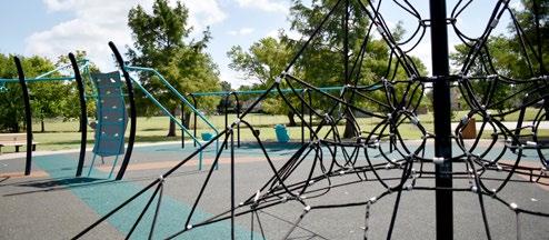 The new Pirate Cove Playground at Founders Park is a vibrant and engaging play area designed to delight children of all abilities. The playground features a smooth poured-in-place surface, artfully colored to resemble ocean water and sandy beaches, creating an immersive and visually appealing environment. The main attraction is a pirate ship-themed structure, perfect for imaginative adventures on the high seas. Additionally, the playground includes a wheelchairaccessible whirl (merry-go-round), ensuring every child can enjoy the fun. The thoughtful design and inclusive features have earned the Pirate Cove Playground a “playground for all” all-inclusive certification through a third-party review by Let Kids Play, an accessibility consulting firm.