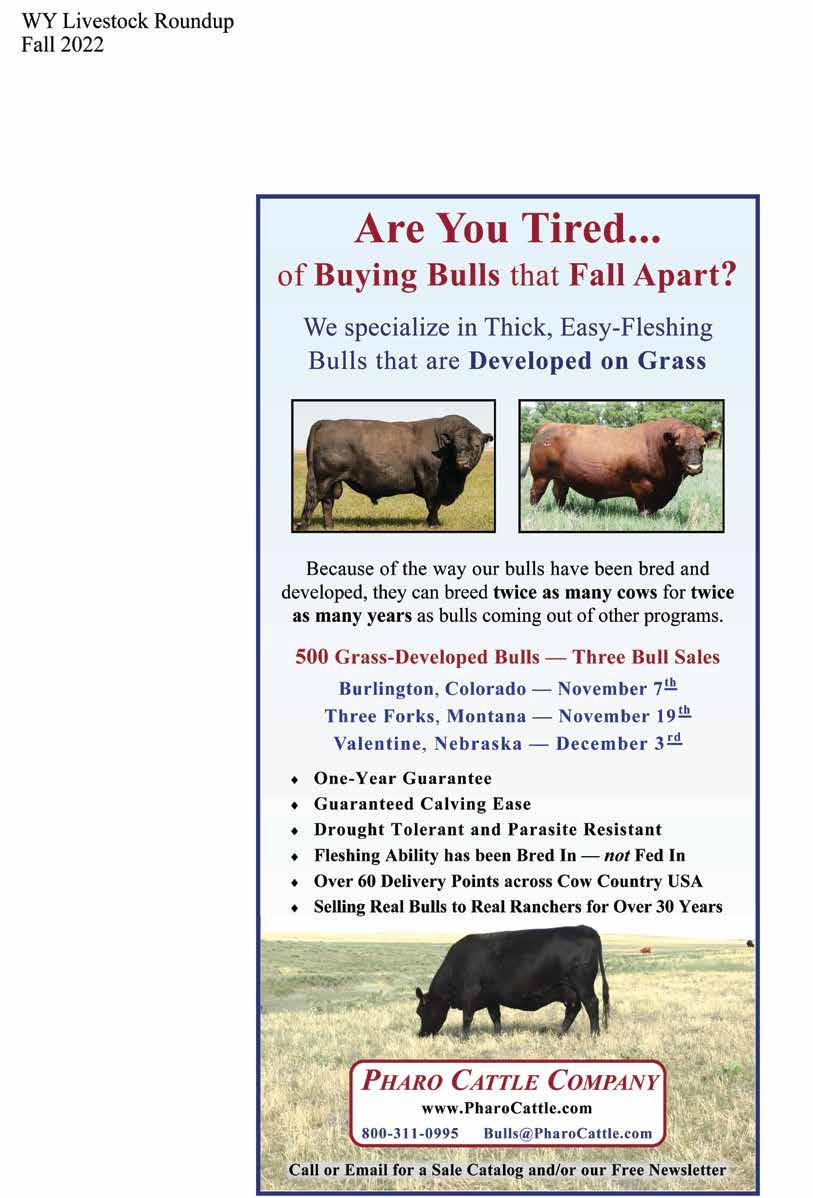 Wyoming Livestock Roundup • Volume 34 No. 22 • September 24, 20222 DENNIS SUN, Publisher • Cell: 307-262-6132 e-mail: dennis@wylr.net Member: Wyoming Stock Growers Association Wyoming Wool Growers Association Wyoming Farm Bureau Federation • Wyoming CattleWomen Livestock Publications Council • National Cattlemen’s Beef Association Fremont County Cattlemen's Association Green River Valley Cattlemen's Association Wyoming Angus Association Converse County Stock Growers Association Carbon County Stock Growers Association Subscription Rates: 1 year: $50; 2 years: $75; 3 years: $110 Postmaster: Send address changes to: andrea@wylr.net Wyoming Livestock Roundup • P.O. Box 850 • Casper, WY 82602 Wyoming Livestock Roundup (USPS # 005-774) is published weekly by Maverick Press, Inc. P.O. Box 850 • Casper, WY 82602 Periodicals postage paid in Casper, WY Fax: 307-472-1781 • E-mail: roundup@wylr.net Wyoming Livestock Roundup Reporting the News by the Code of the West Phone: 307-234-2700 800-967-1647 • www.wylr.net BRITTANY GUNN, Editor • brittany@wylr.net KAITLYN ROOT, Editor • kaitlyn@wylr.net CANDICE PEDERSON, Production Coordinator • candice@wylr.net JODY MICHELENA, Advertising Director • jodym@wylr.net DENISE OLSON, Classified Sales Manager • 307-685-8213 • denise@wylr.net ANDREA ZINK, General Manager • andrea@wylr.net CURT COX, Director of Livestock Field Services • 307-630-4604 • curt@wylr.net CALLI WILLIAMS, Livestock Field Services Rep. • 605-695-1990 • calli@wylr.net This publication is © 2022 by Maverick Press, Inc. From the Publisher Dennis Sun GUEST OPINIONSThe Unknowns are Present American Energy Security Begins with Agriculture