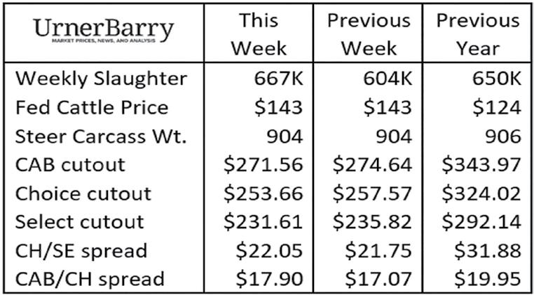 Prices have fallen quickly over the past two weeks on the boxed beef side of the business. The Choice cutout is down eight dol lars per cwt in that period with this week’s early quotes down to $252 per cwt.