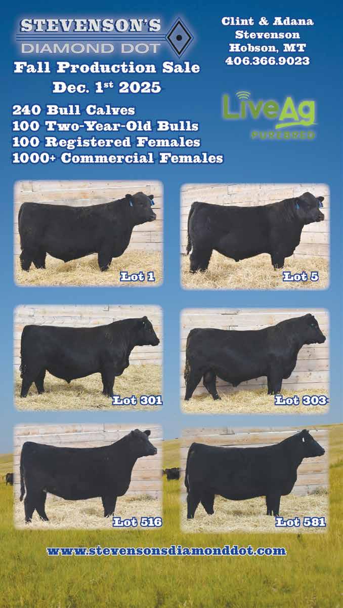 @ 10:30 A.M. CALVES Ed & Garrett Miller- 225 Blk Ang & AngX Strs & Hfrs 500-575#. Rec Once PMH IN & Vision 7 w/Somnus @ branding. One Brand. Powerful, Choice, High desert calves! John & Kay Stoll- 180 Blk & Red Strs & Hfrs 475-550#. Rec Vision 7 w/ Somnus @ Branding. Knife cut. All natural. Sired by Lim Flex bulls. High elevation, powerful & fancy! Dale & Amy Hamilton- 110 Blk Ang & AngX Strs 500-575#. 65 Blk Ang & AngX Hfrs 475-550#. Rec Once PMH IN & 7 way. Knife cut @ branding. Sired by Paintrock Blk Ang bulls & small % Hereford. Reputation, high desert, choice!! Woolsey Farms- 150 Blk Ang & AngX(F1) Strs & Hfrs 450-550#. Rec Virashield 6, 8 way & poured. 45 days weaned. Green, Choice weaned calves! Tim & Margo Barkhurst- 100 Blk & BWF Strs & Hfrs 450-550#. Rec Vision 7, Virashield 6 & Nasalgen @ branding & Precon(9-28); CattleActive @ birth, branding & Precon. High elevation. Sired by Herring Angus, CSU Angus & CSU Hereford bulls. Reputation & Fancy!! Falula Farms- 85 Blk Ang & AngX Strs & Hfrs 500-525#. Rec 8 way @ branding. High desert calves. Keller Ranch- 55 Blk Ang Strs & Hfrs 480580#. Rec Vision 7, Virashield 6 & Polybac @ branding & Precon(9-28); CattleActive @ birth, branding & Precon. High elevation. Sired by Lucky 7 Blk Angus Bulls. Reputation & Fancy!! Ron & Dee Kobbe- 30 Blk & BWF Strs & Hfrs 550-650#. Rec Virashield 6 & Vision 7 @ branding & Precon (10-1).