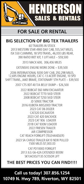 SOLD MY LOADERS, HAVE OVER $12K WORTH OF INVENTORY!! e in the b , flters, glass, belts, and more. Will ft hn eere , and 744K, $3,500 for all or would trade for skid steer attachments or a good car trailer. Call 307259-4321 4/19
