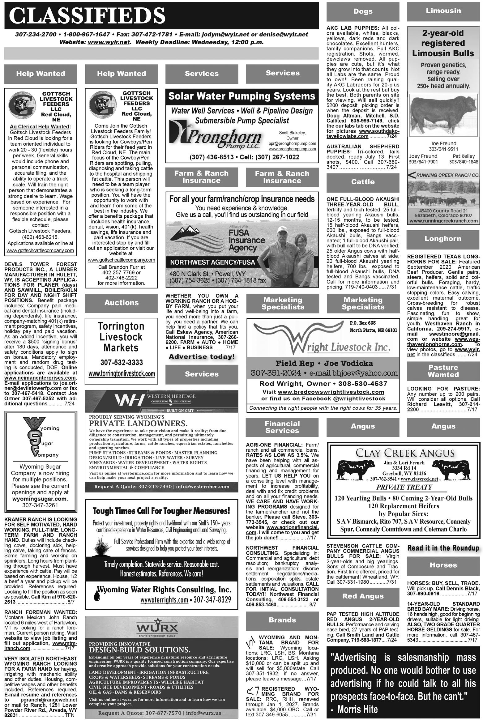 Jones, Randall - Otto 1 Blk Cow, 1660#.....................$7350 Bennett/M & M Trust - Manderson 1 Hfrd Cow, 1775#...................$7325 1 Hrfd Cow, 1320#...................$6350 Haun, Bill - Worland 1 Blk Cow, 1595#.....................$7250 1 Blk Cow, 1720#.....................$7200 3 Blk Cows, avg. 1525#...........$7200 2 RWF/Bk Cows, avg. 1558#..$7100 1 Blk Cow, 1910#.....................$7000 1 Blk Cow, 1540#.....................$7000 5 Blk Cows, avg. 1534#...........$7000 1 BWF Cow, 1570#..................$7000 1 Blk Cow, 1660#.....................$7000 2 Blk Cows, avg. 1643#...........$7000 1 Blk Cow, 1490#.....................$6800 3 Blk Cows, avg. 1492#...........$6750 2 Blk Cows, avg. 1460#...........$6750 1 Blk Cow, 1255#.....................$6700 1 Blk Cow, 1385#.....................$6700 2 Blk Cows, avg. 1345#...........$6550 1 Blk Cow, 1225#.....................$6300 2 Blk Cows, avg. 1220#...........$6200 2 Blk Cows, avg. 1330#...........$6200 2 Blk Cows, avg. 1300#...........$6200 Walker, Eric - Burlington 1 Blk Cow, 1645#.....................$7250 Thomas, Fred - Meeteetse 2 Blk Cow, 1843#.....................$7100 Friesen, Joshua - Cody 2 Blk Cows, avg. 1553#...........$7100 1 Red Cow, 1380#...................$6500 Hessenthaler, Charles - Lovell 2 Blk Cow, 1585#.....................$7100 Nicholas Ranch - Fort Washakie 1 Blk Cow, 1655#.....................$6800 3 BWF Cows, avg. 1402#.......$6800 2 Blk Cows, avg. 1293#...........$6800 1 BWF Cow, 1315#..................$6750