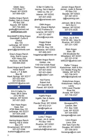 H B & D Cattle Co. Haas, Bill & Dana 2312 Rd 60 Veteran, WY 82243 307-837-2925 Ken Haas Angus Haas, Ken 4766 State Hwy 151 LaGrange, WY 82221 307-834-2356 kenhaasangus.com Herring Angus Ranch Herring, Kal & Vickie Box 275 Encampment, WY 82325 307-327-5396 kvsherring@yahoo.com 38